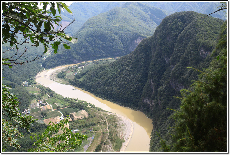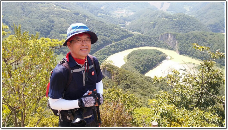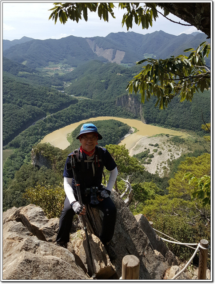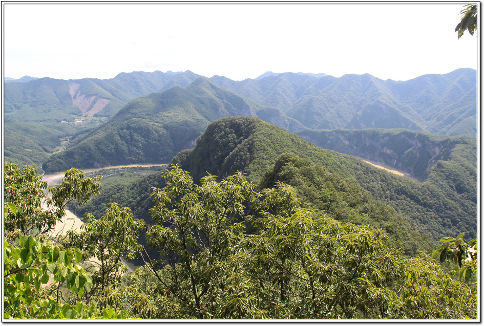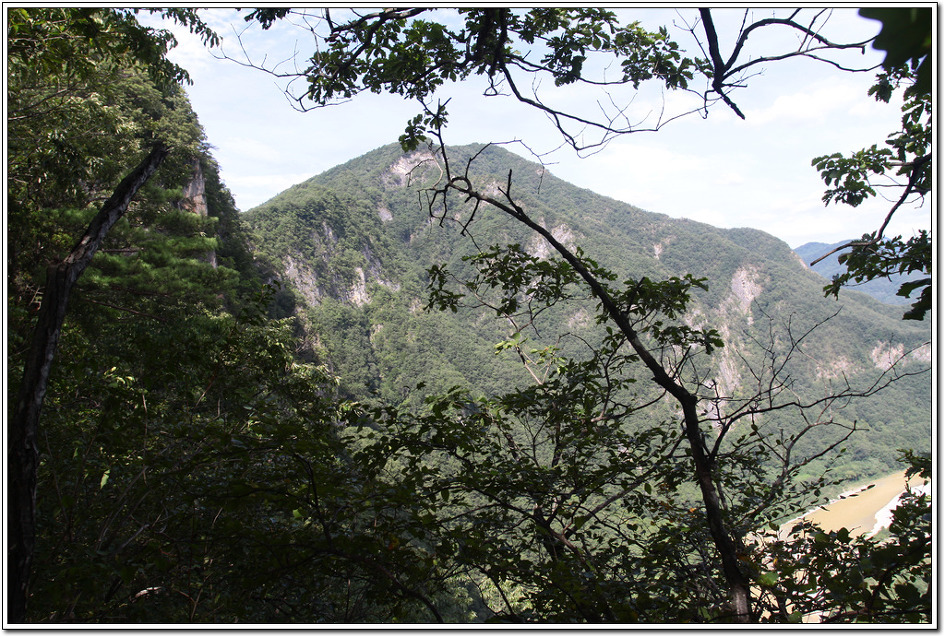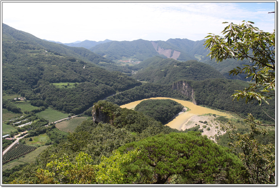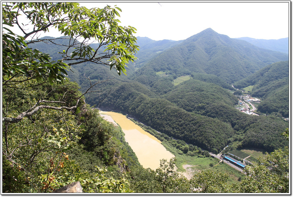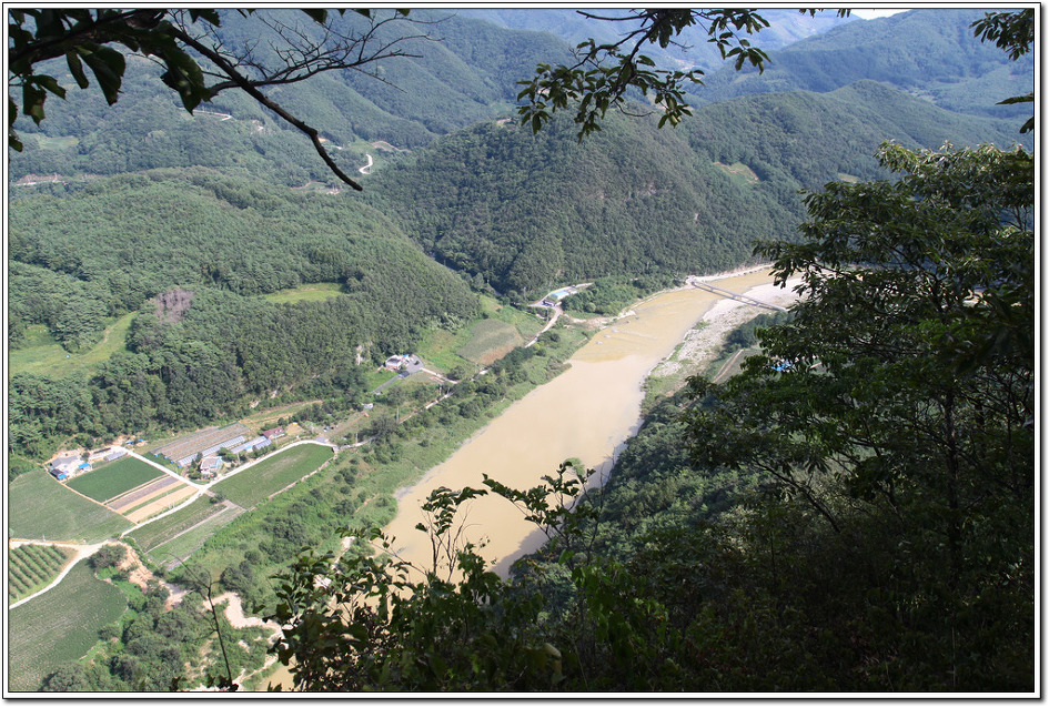 ▼ 조금 더 오르니 본격적인 조망이 터지는데 한반도지형의 일부가 드러났다. 이곳이 동강 레프팅을 즐기는 곳인 어라연 부근에서 그리 멀지 않은데 후에 같은 날 래프팅을 한 팀의 블로그를 보니 그곳은 이런 흙탕물인 것 같지 않은데 어찌된 영문인지 모르겠다. 그곳까지 흐르는 동안 정화됐단 말인가?