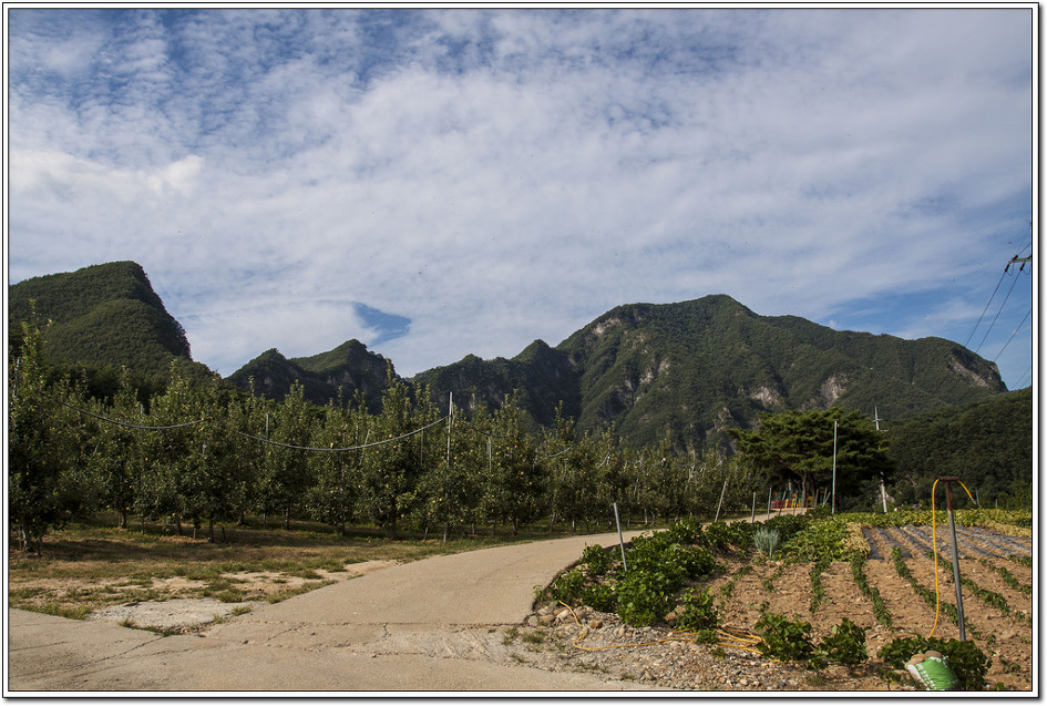 ▼ 제법 큰 면적의 사과나무 과수원이 이 일대에 자리잡고 있어 가뭄에도 잘 견뎌낸 탐스럽게 열린 사과를 보며 마을길을 지난다.