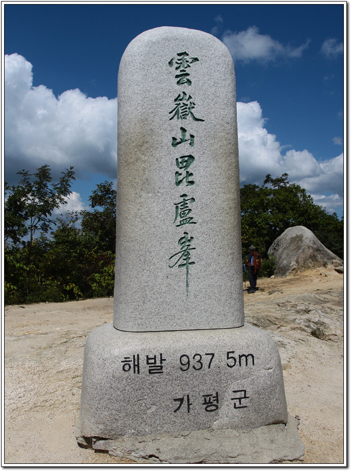 ▼ 서봉의 정상석은 두개가 세워져 있다. 한개는 가평군에서 세웠고 또 하나는 포천시에서 세웠다. 한 봉우리에 두개가 세워져 있다보니 어느 정상석에서 인증을 해야할까 망설이다 아예 두군데서 인증을 하는 이들이 있다. 이러한 예는 필시 이곳만이 아닐 것이란 생각이다. 민주지산의 삼도봉은 충북, 경북, 전북의 경계지점에 있어 그럴 듯한 정상석이 놓여져 있다. 이곳의 정상석을 보노라면 서로 등을 돌리고 있는 형상이다. 이곳도 포천시와 가평군의 경계지점인지는 정확히 모르겠으나 정상은 가평군에 속해 있는 것으로 도상에는 표시되어 있다. 누가 봐도 별로 좋아 보이지는 않는다. 차라리 원주의 감악산과 같이 이곳도 동봉과 서봉이 있으므로 하나씩 나눠서 정상석을 세웠으면 어떨까 하는 생각이다.