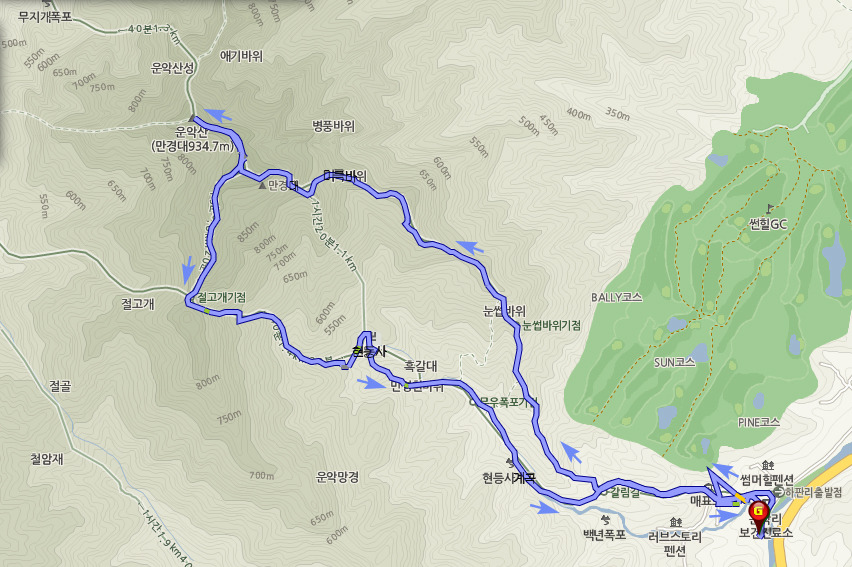 ♣ 코스: 현등사일주문-눈썹바위-병풍바위-만경대-동봉-서봉-동봉-남근바위-코끼리바위-현등사-원점회귀