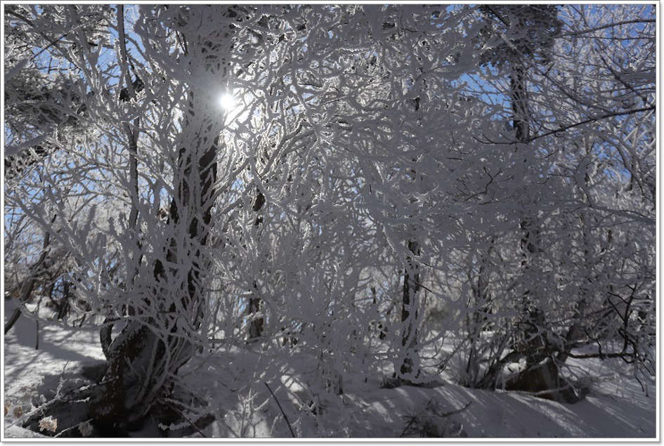 ▼ 상고대는 영하의 온도에서도 액체 상태로 존재하는 물방울이 나무 등의 물체와 만나 형성된다. 올해 들어 처음으로 접하는 상고대이기에 별천지온 것 같다.