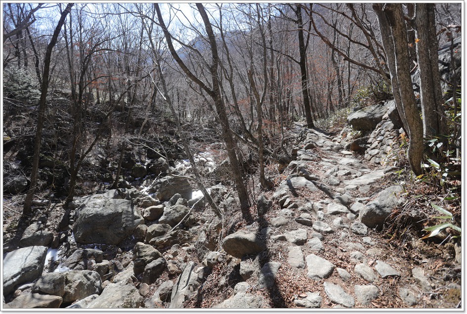 ▼ 하산길이 얼음이 얼어 아이젠을 계속 착용하다 어느지점 부터 아이젠을 벗게 되었는데 발바닥의 피로가 누적됐다. 물집이 잡힌 회원도 더러는 있다더라.