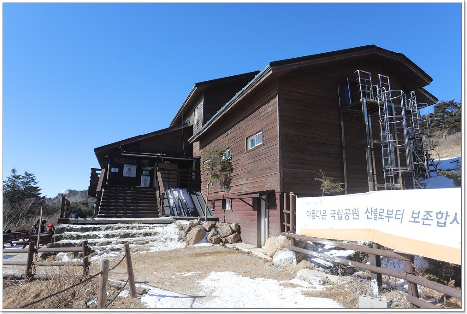 ▼ 장터목대피소에 도착한 시간은 9시가 조금 넘은 시간이다. 새벽에 햄버거를 먹고 출발했는데 공복으로 인해 뱃힘이 없으니 속도가 떨어질 수 밖에 없다. 아침 식사를 하기 위해 슈퍼에서 산 햇반을 꺼내 온수를 부으려는데 밥이 모두 얼어 손으로 비비니 가루가 되어 버린다.