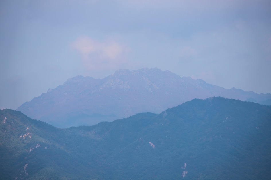 ▼ 역광이긴 하지만 의상봉에서 서쪽 방향으로 바라본 풍경도 그 어느 산 못지 않은 멋진 풍경이다. 가운데 멀리 볼록 솟은 봉우리가 금귀봉, 오른쪽 멀리는 보해산이 조망된다.