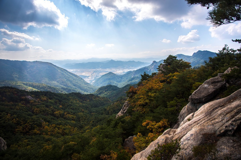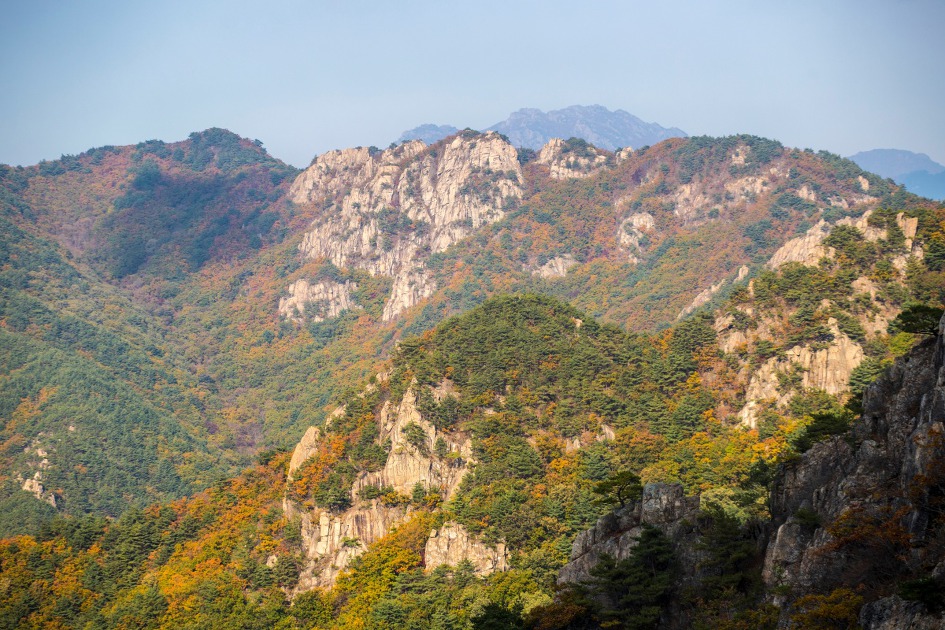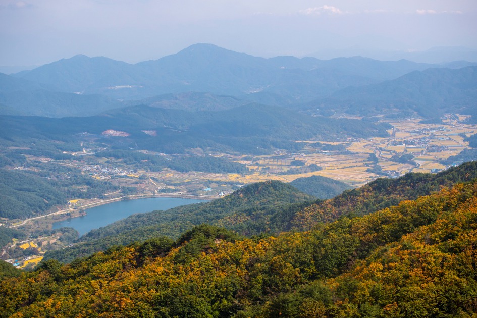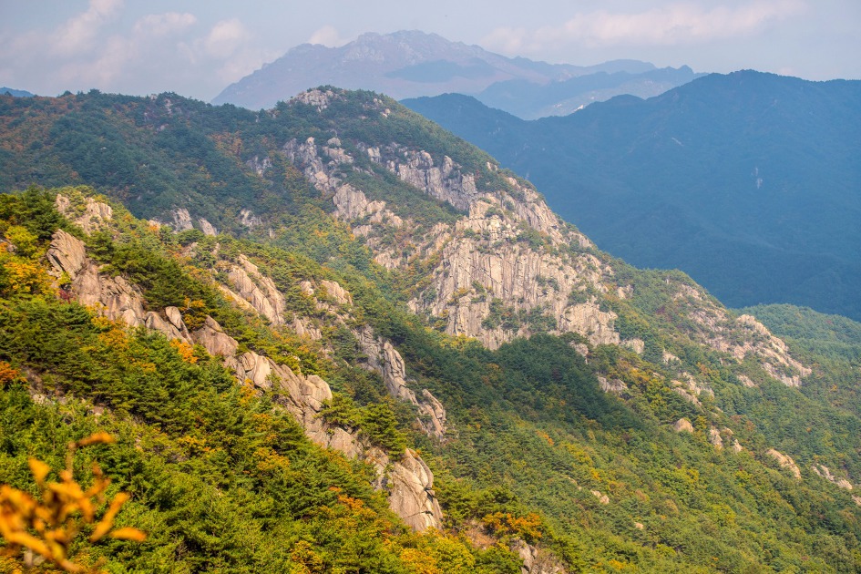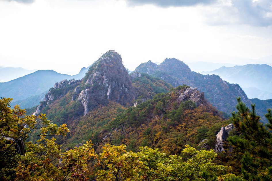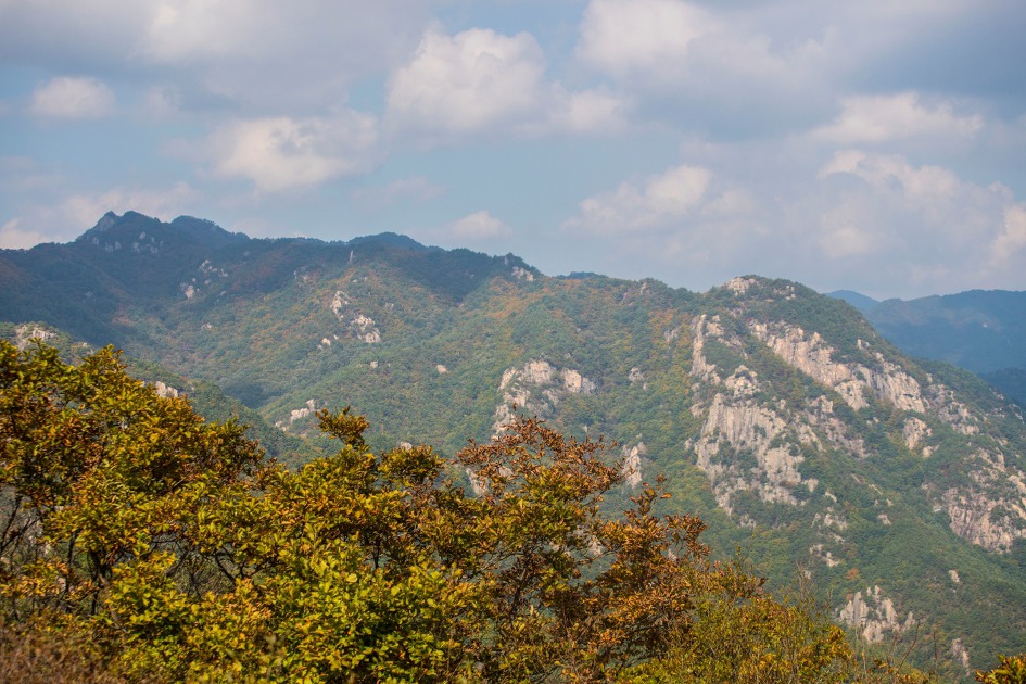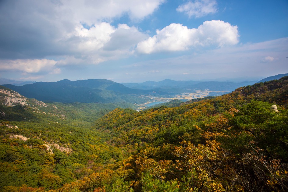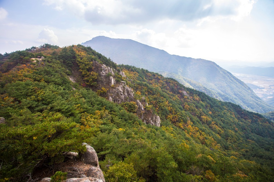 ▼ 가야산이 멀리 아스라히 보이고 우두산 정상에서 북쪽으로 뻗은 능선의 단풍이 서서히 물들어 간다.