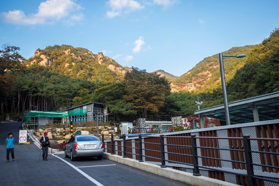 ▼ 다리를 건너고 있는데 통제요원이 빨리 나오라고 외쳐대지만 이미 뗀 발걸음은 반대편으로 향하고 맨처음 바라본 오르쪽 편의 전망대에서 한 컷 담아봤다. 왼쪽이 최초 입구 지점이고 오른쪽이 아직 개통되지 않은 마장재로 오르는 입구이다.