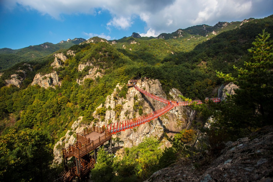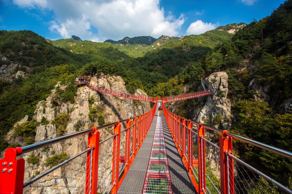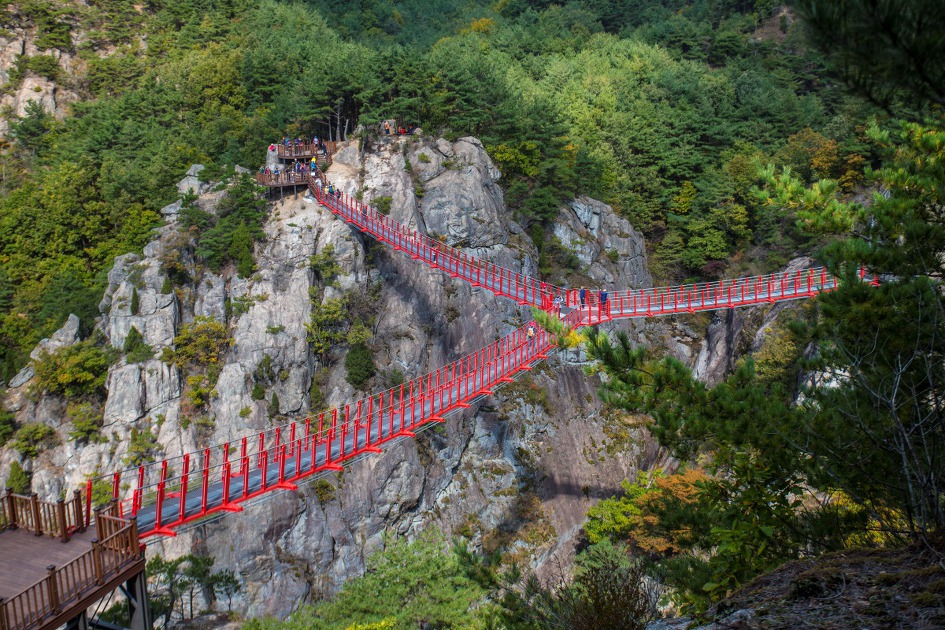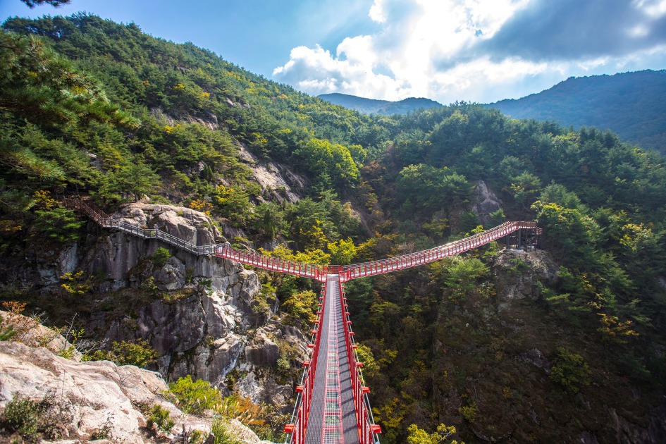 ▼ 계곡은 다른 산의 출렁다리, 구름다리, 하늘다리에 비해 길지는 않으나 꽤 깊은 편이고 계류의