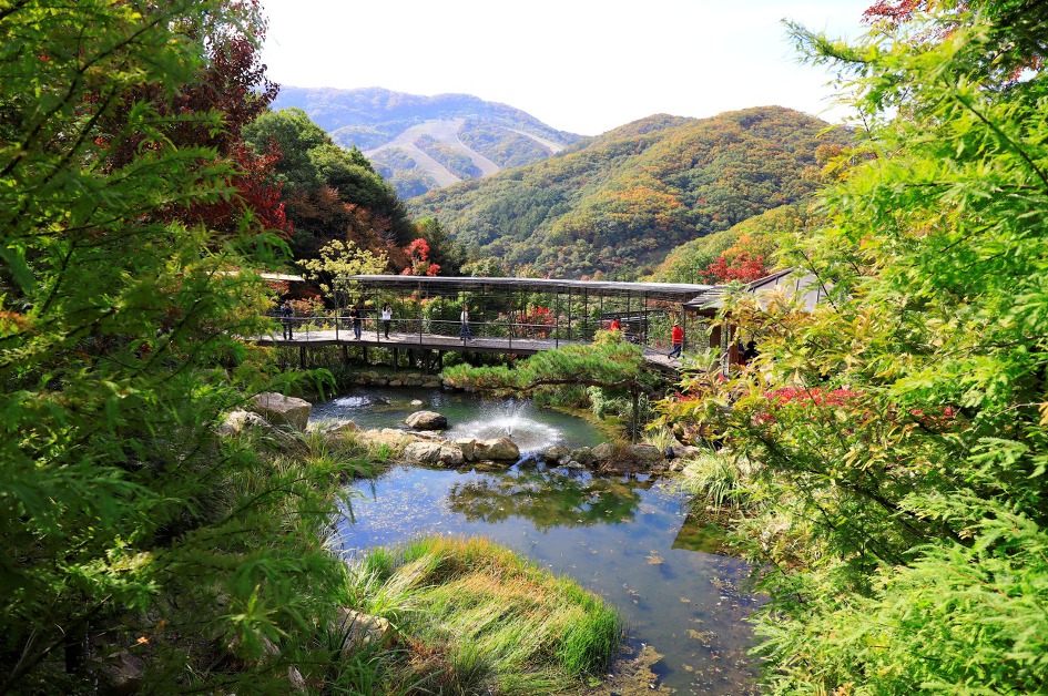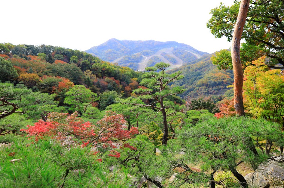 ▼ 모노레일을 타고 오르지 않는 사람들이 많은데 직원들이 모두 타고 오른다고 하니 단체 이동에서 안탈 수도 없고 영 마뜩지 않은 가운데 정상에 올라 전망대에서 바라 본 풍경...반대편 산에는 스키장이 보이고 산은 붉게 물들어 간다. 나중에 알고 보니 걸어 올라오면 볼 수 있는 자작나무 숲은 아예 볼 수 없었음이 너무 아쉽다.