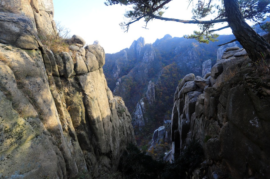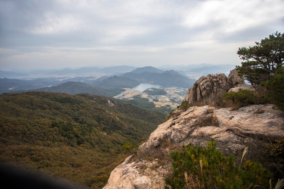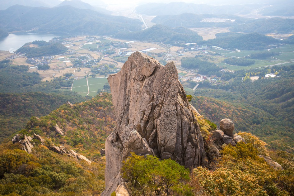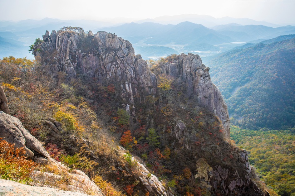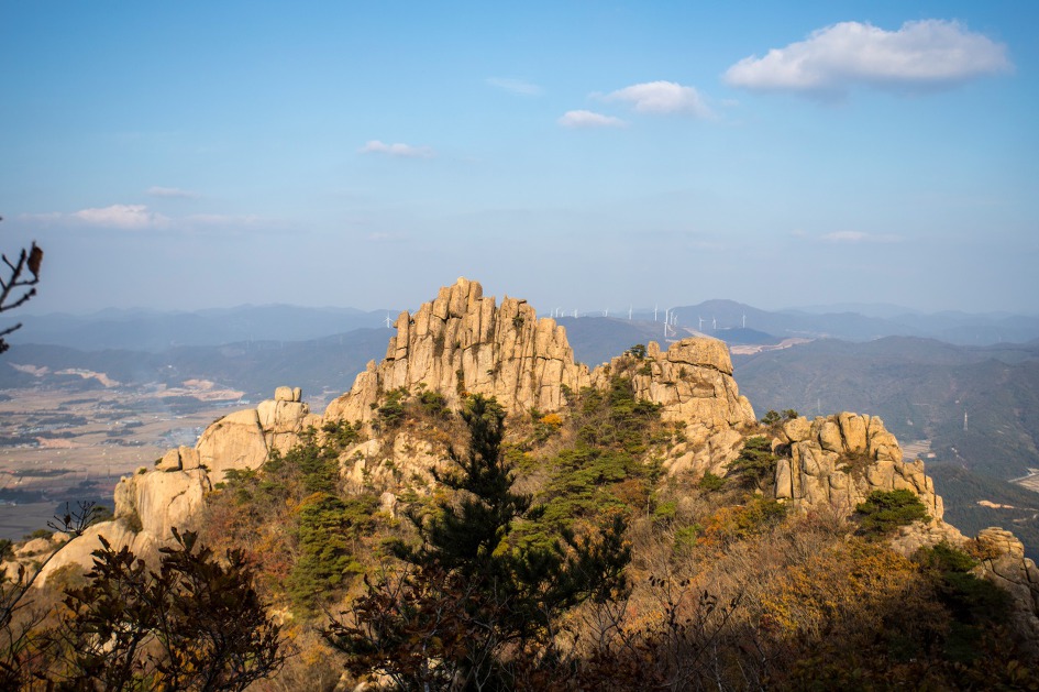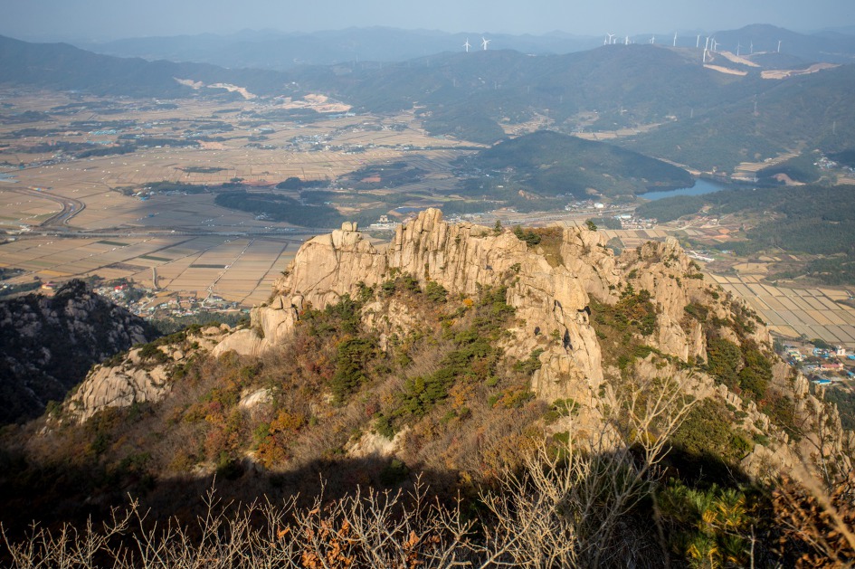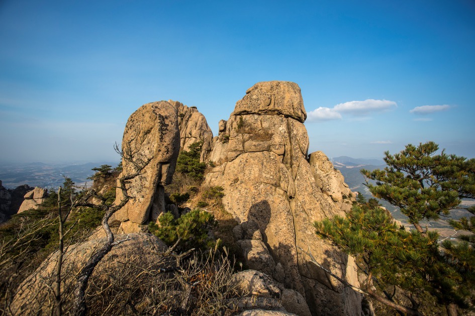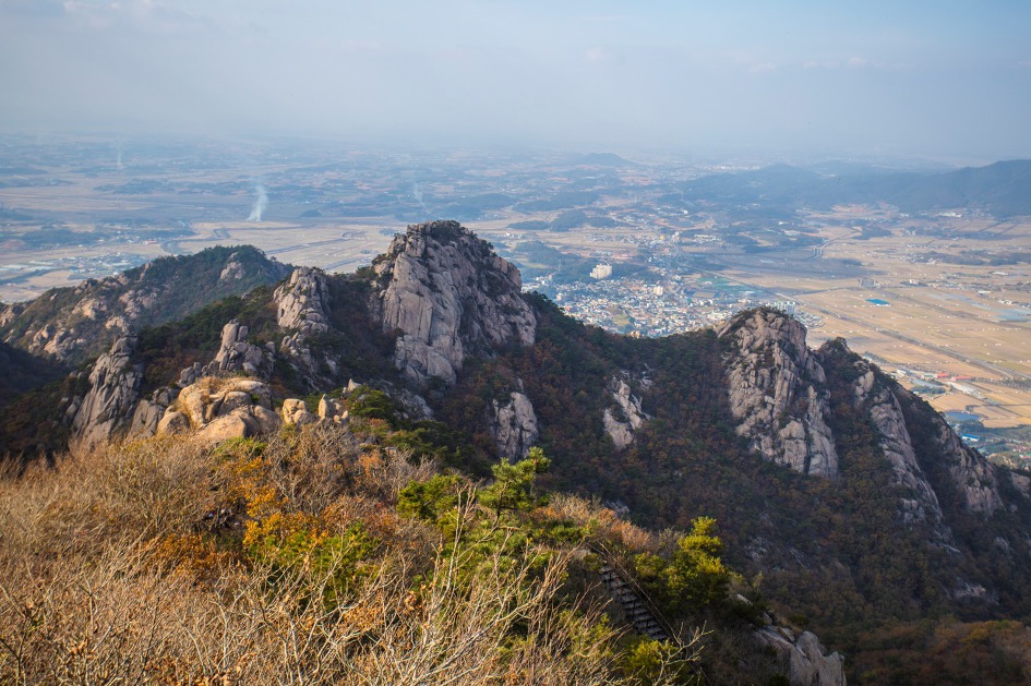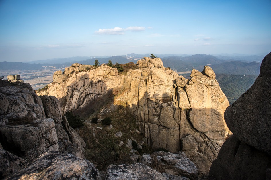 ▼ 암릉 사이로 펼쳐진 풍경도 볼만하다.