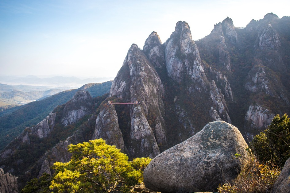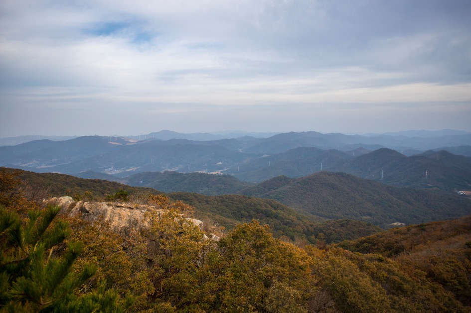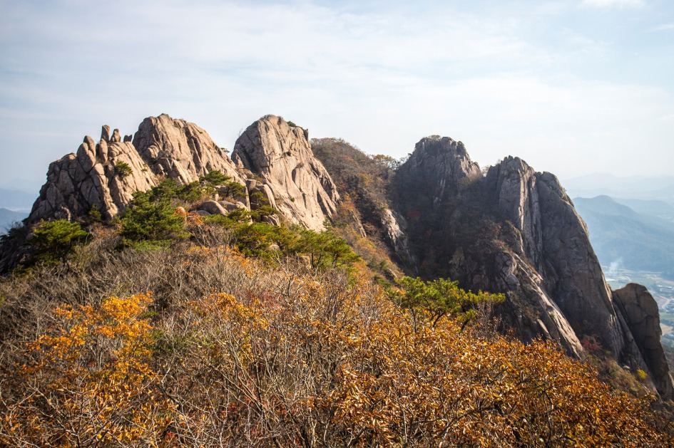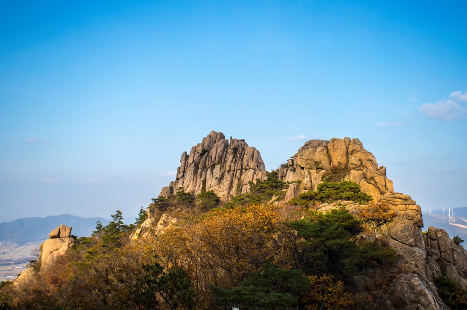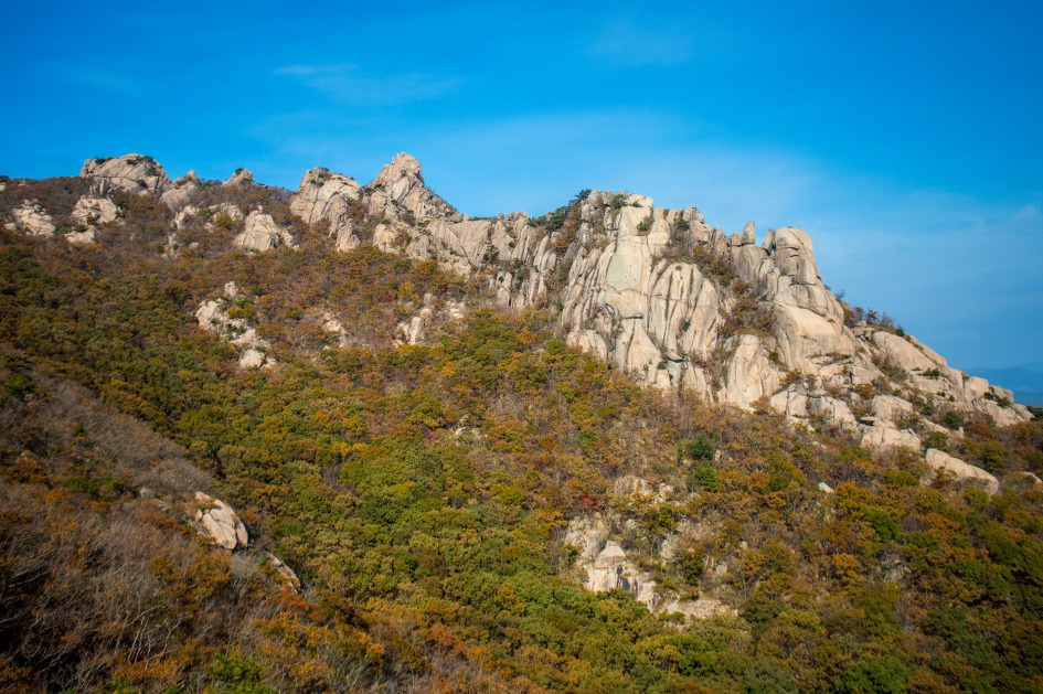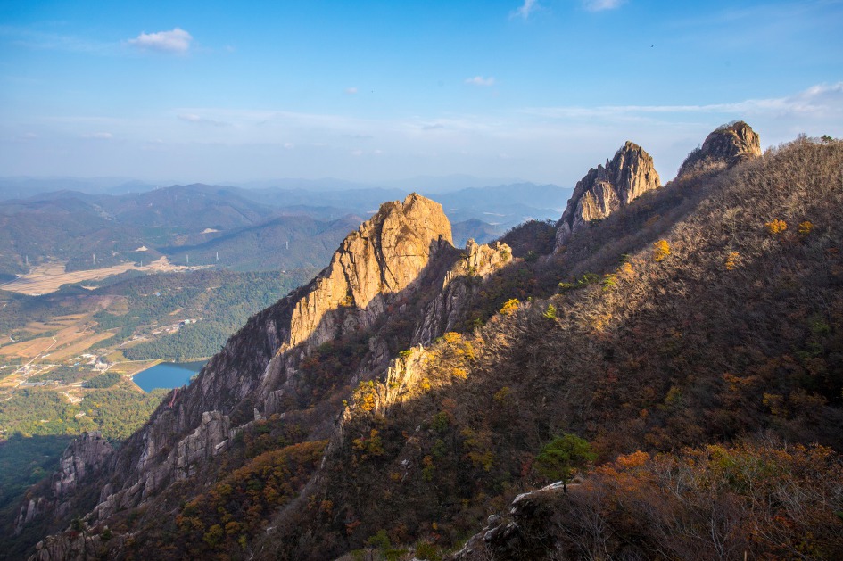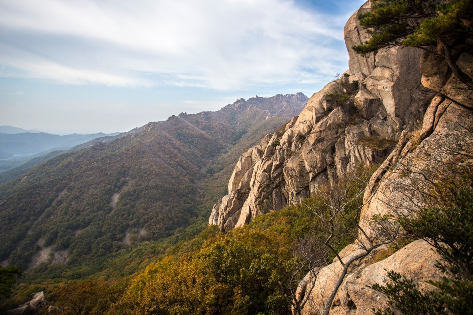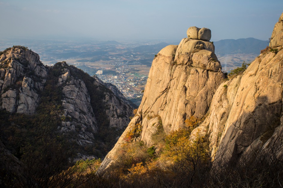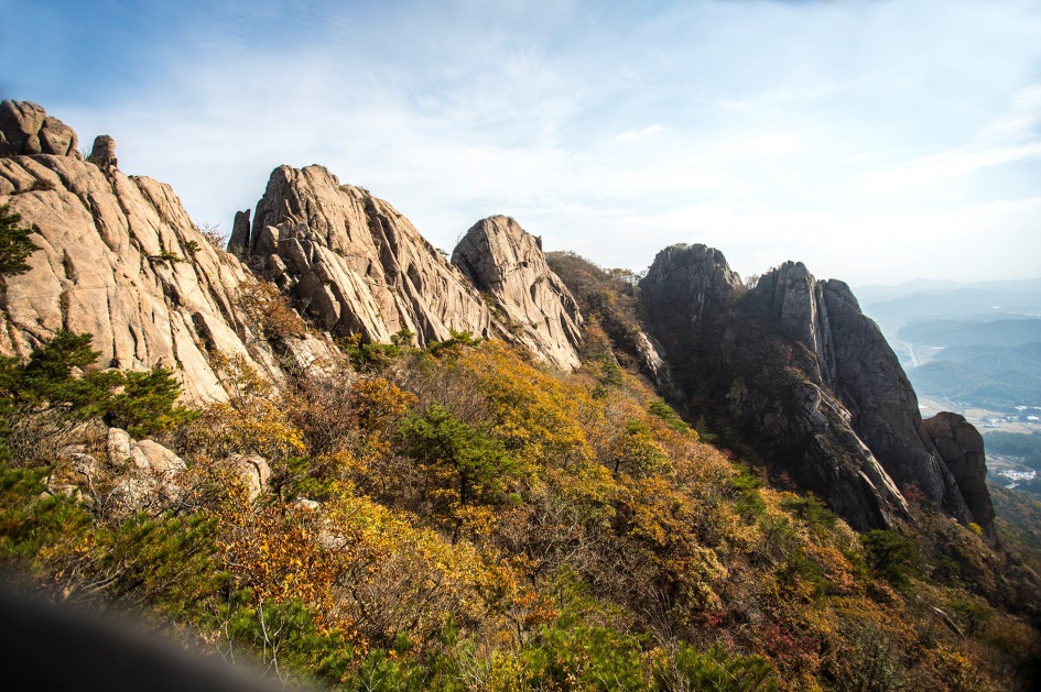 ▼ 암릉 사이로 펼쳐진 풍경도 볼만하다.