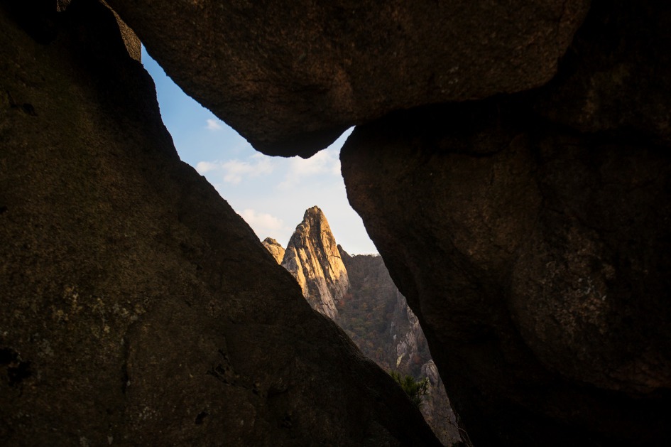 ▼ 바로 앞에 나타난 장군봉의 위용...뉘엿 넘어가는 황금색 햇살에 마치 거대한 트로피를 연상케 한다. 장군봉 바로 아래로 하산길이 있어 이제 주변 풍경은 거의 마무리 되는 시간이다.