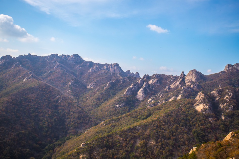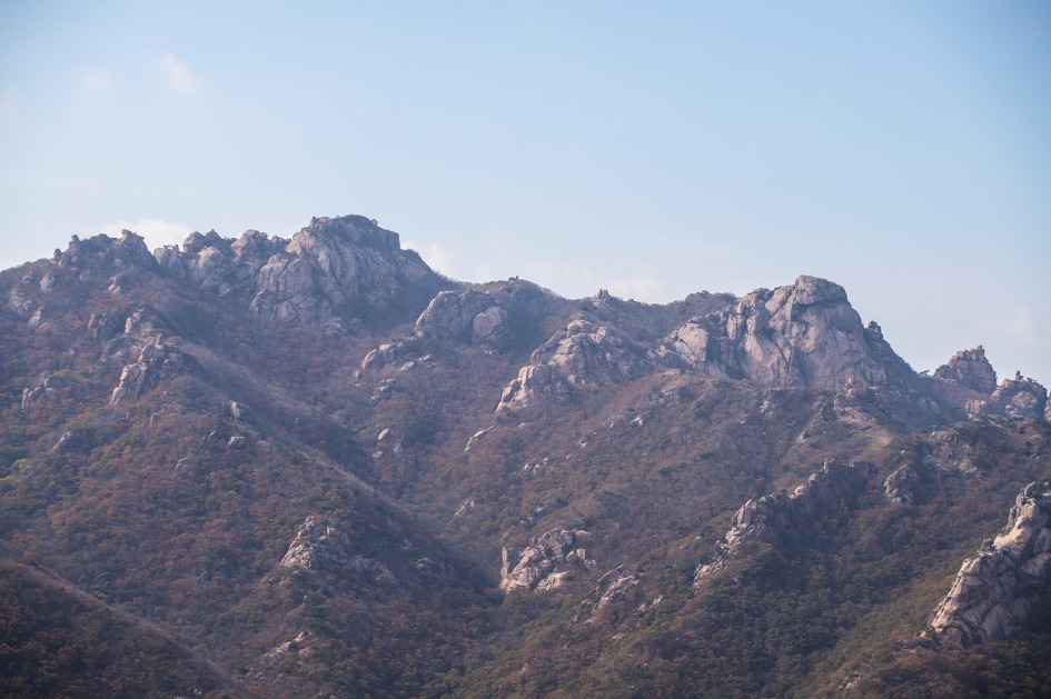 ▼ 암봉으로 이뤄진 산들은 망원렌즈로 암봉들을 적당하게 잘라보는 재미도 있다. 이곳에서 보면 왼쪽이 더 높은 향로봉 같지만 오른쪽이 향로봉이다.