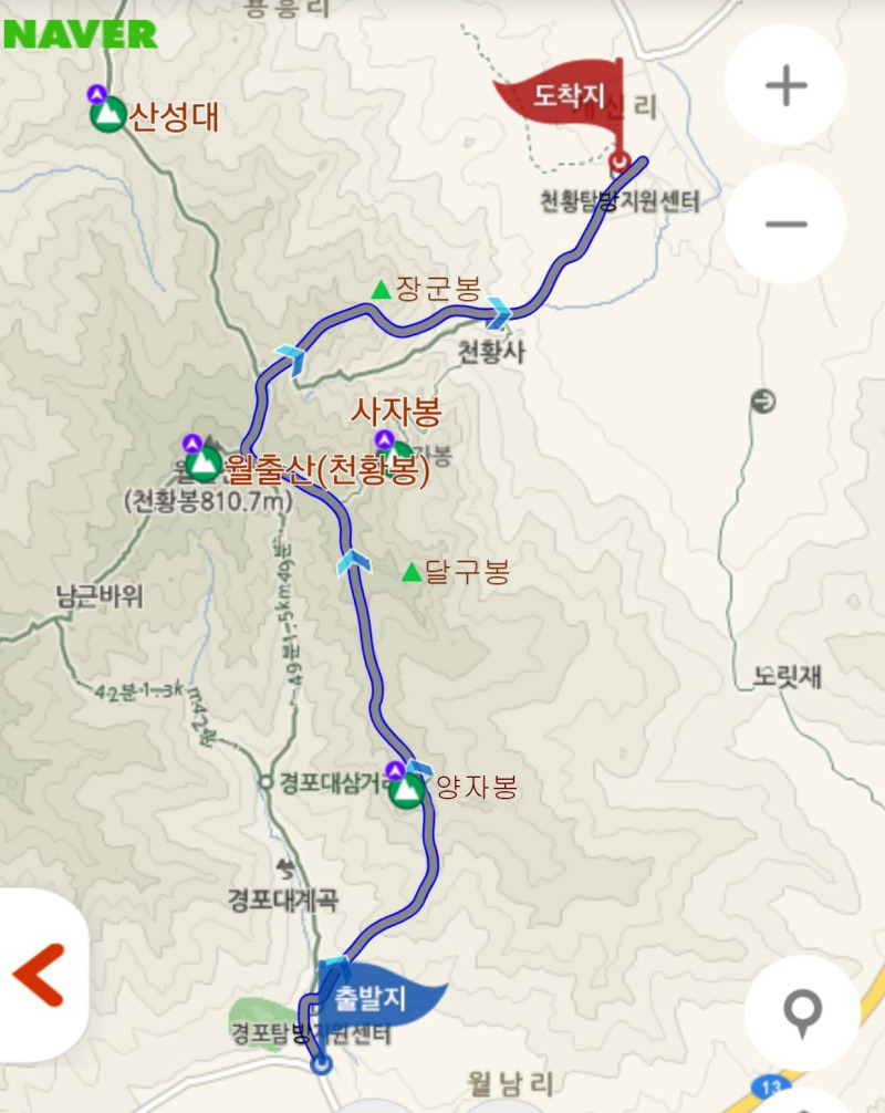 ♣ 코스: 경포대탐방지원센터-양자봉-양자봉능선-통천문삼거리-광암터삼거리-육형제바위-장군봉-천왕사-천황주차장