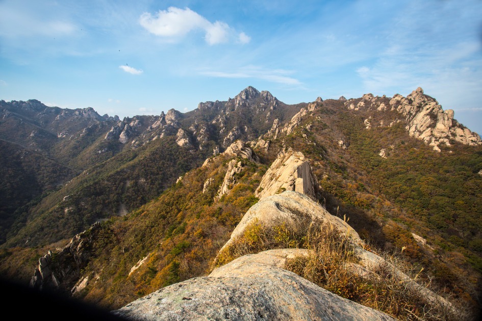 ▼ 진행방향의 칼날과 같은 암릉...그나저나 사진 정리를 하다보니 카메라 후두가 느슨해졌는지 렌즈에 가려져 왼쪽 아랫 부분이 까맣게 찍혀 아쉽게 됐다.