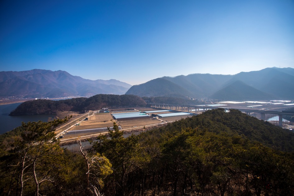 ▼ 대구에서 부산간 중앙고속도로가 고가를 이뤄 일직선으로 뻗어있고 이곳 농촌도 비닐 하우스로 덮혀있다.