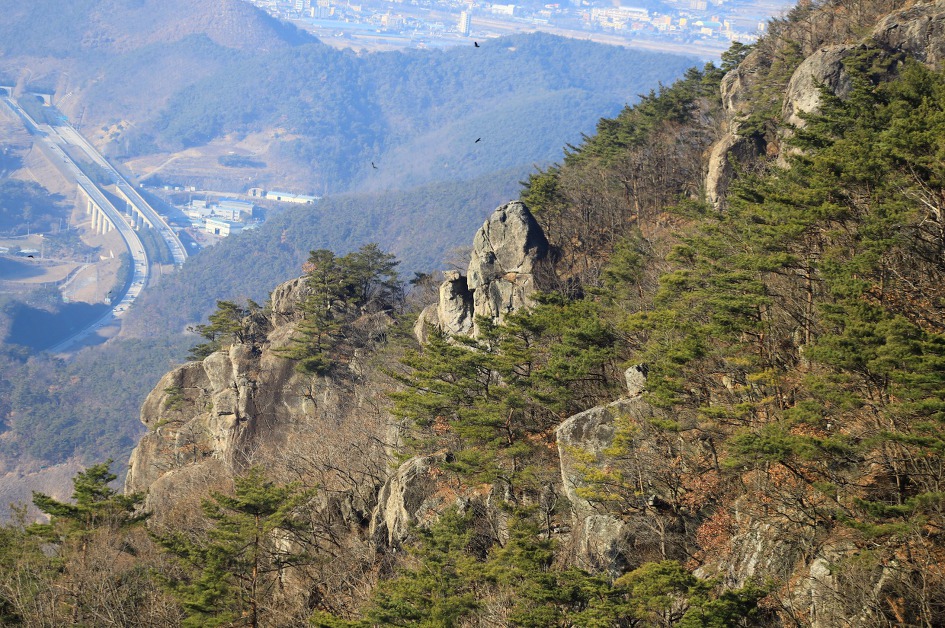 ▼ 거의 하산하여 뒤돌아 본 무척산 서쪽 방향의 능선은 정상까지의 산행 중 전혀 예상치 못한 기암으로 형성된 산으로 바위 하나 하나를 살펴 보려면 몇날 며칠은 걸려야 할 규모이다. 도상에 표시되어 있는 장군바위와 탕건바위는 어느 위치에 있는지 몰라 보지 못한 것이 좀 아쉽다.