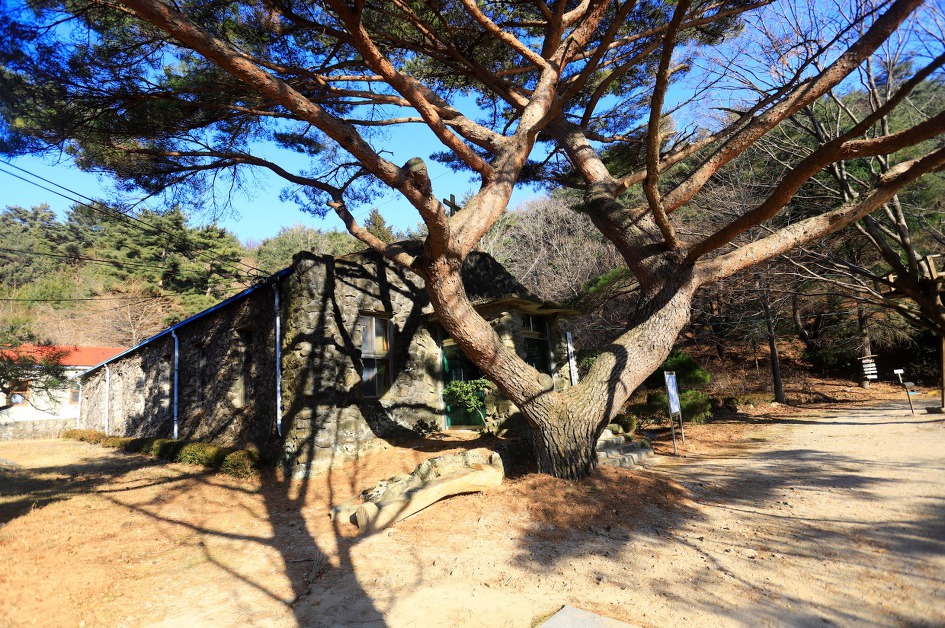 ▼ 일제시대때 신사참배 및 기독교 탄압에 항거하며 구국기도의 처소로 삼은 기도원이라는데 그 앞 건물에 예사롭지 않은 소나무가 눈길을 끈다.