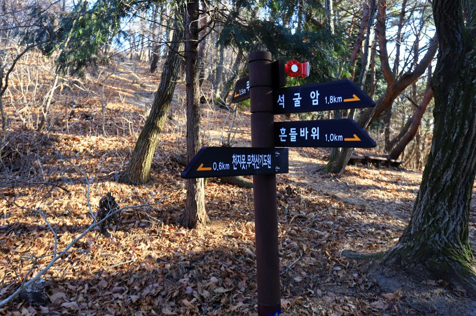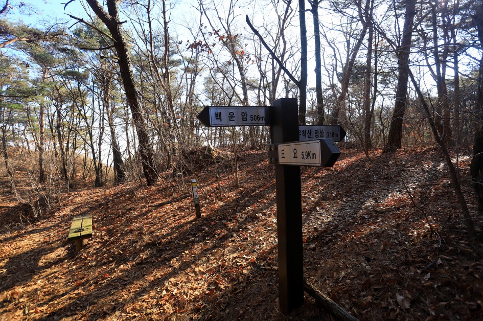 ▼ 첫 이정표를 보니 정상이 가까왔음을 알 수가 있다. 이곳부터는 낙엽이 쌓인 부드러운 흙길로 순탄하게 정상까지 이른다.