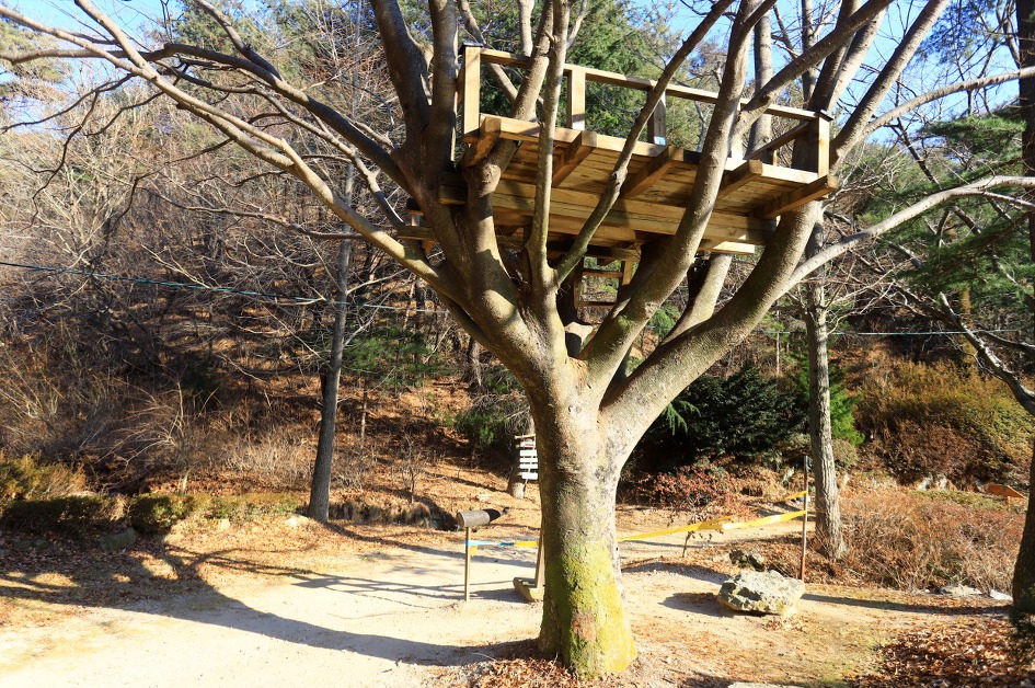 ▼ 소나무 옆의 느티나무는 사다리를 타고 올라 쉴 수 있는 원두막 형태의 쉼터가 있어 한 여름에 더위를 식히기에는 그만이겠다.