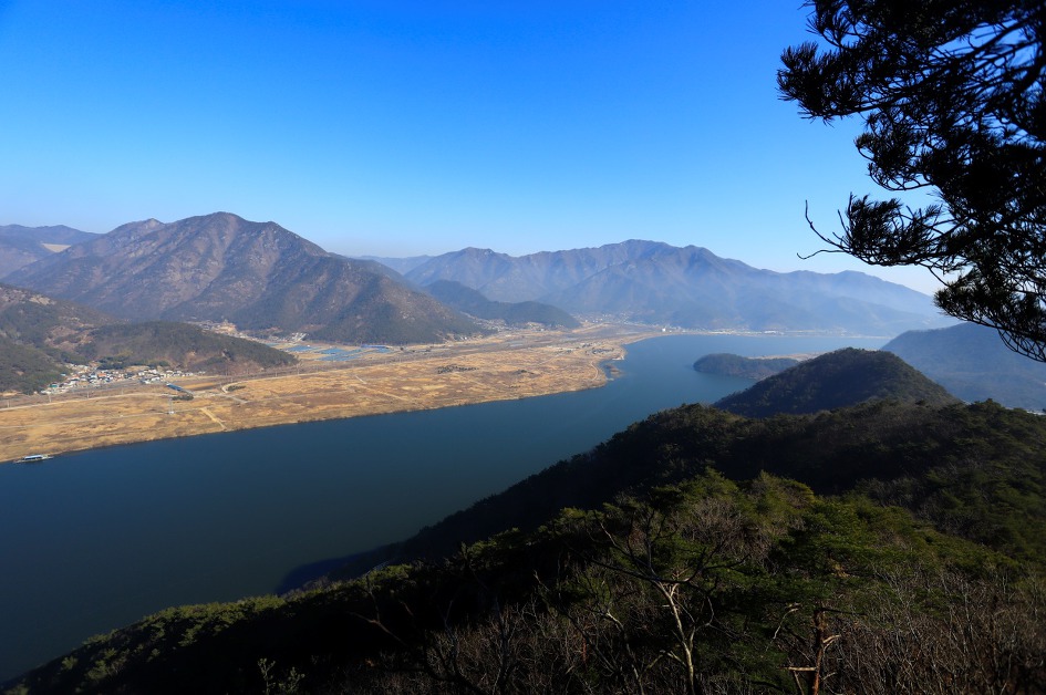 ▼ 어느 정도 산 능선에 올라오니 끝도 없이 쭉쭉 뻗은 강줄기가 시원하게 펼쳐지면서 눈을 즐겁게 한다. 두 능선 가운데 끝자락으로 천태호 제방이 하얗게 살짝 보이고 그 뒤로 볼록하게 천태산이 보인다. 나룻배라도 하나 있으면 처녀뱃사공 노래가 절로 나올 풍경이다.