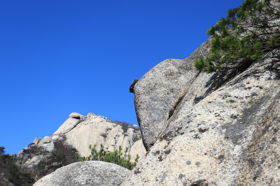 ▼ 신랑신부바위에서 흘러내린 능선이지만 자세히 보면 인수봉과 겹쳐져 있어 왜곡된 모습인데 다른 곳에서는 볼 수 없는 풍경들이다.