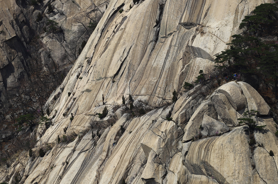 ▼ 클라이머들이 한창 클라이밍을 즐기고 있다. 인수봉 정상까지 오르려면 몇 시간을 용을 써야겠다.