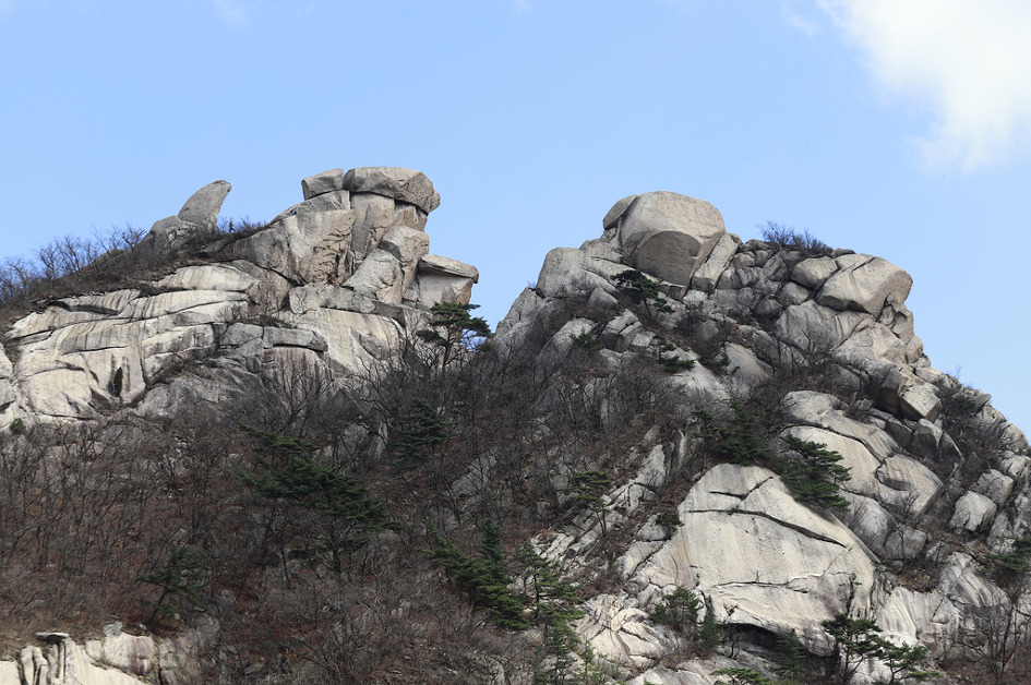 ▼ 왼쪽 백운대와 오른쪽 신랑신부바위, 그 밑으로는 대머리바위라는데...왼쪽의 신랑바위에 유두바위가 있으니 윗부분의 모습과는 사뭇 다른 분위기다.