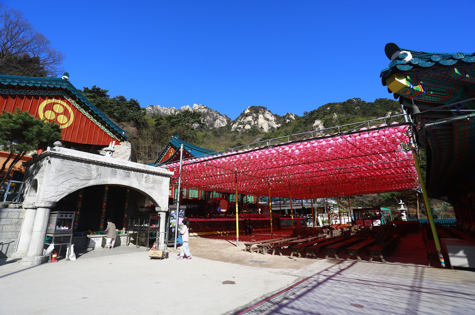 ▼ 북한산우이역에서 하차하여 산행 시간을 절약하기 위해 택시를 타고 도선사 주차장에 내려서 산행을 시작한다. 도선사 일주문으로 이어진 연등이 화려한 모습으로 객들을 맞는다.