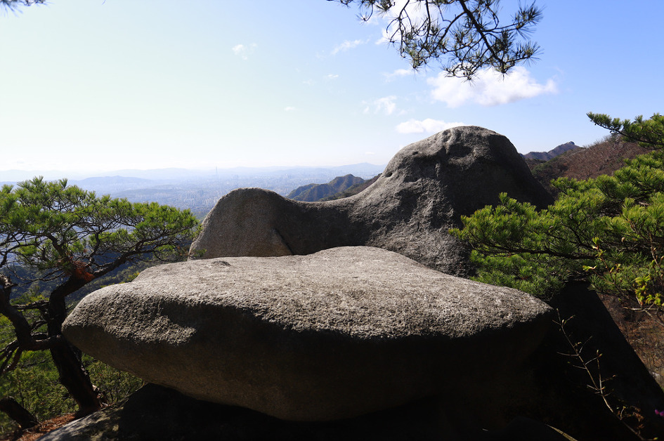 ▼ 찐빵을 올려 놓은 것 같은 저 바위는 곰바위라고 하는데 다른 쪽에서 보아야 곰의 형상을 볼 수 있다고 한다. 오른쪽 영봉과 멀리 도봉산이 포착됐다.