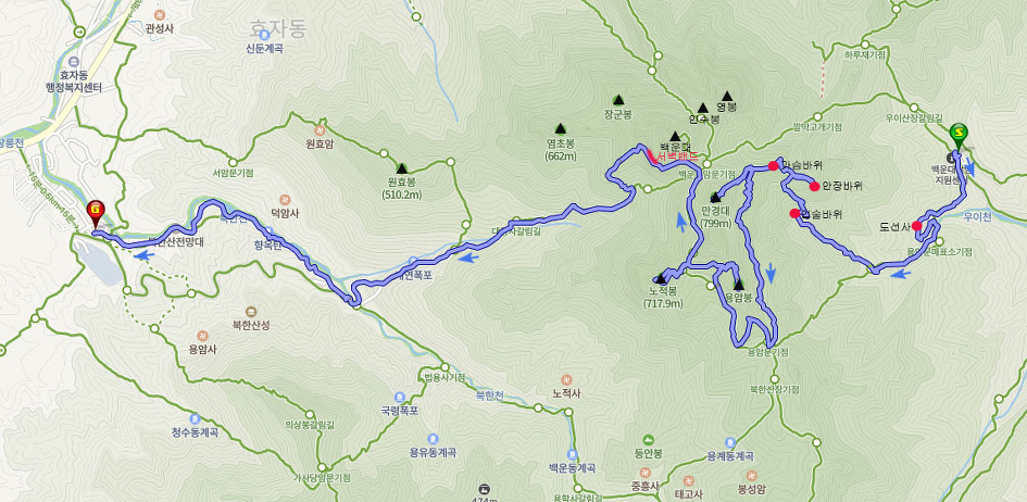 ♣ 산행코스: 우이역-도선사-김상궁사리탑-입술바위-안장바위-가슴바위(신랑,신부바위)-만경대-용암문-용암봉-노적봉-서벽밴드-북한산계곡길-북한산탐방지원센터