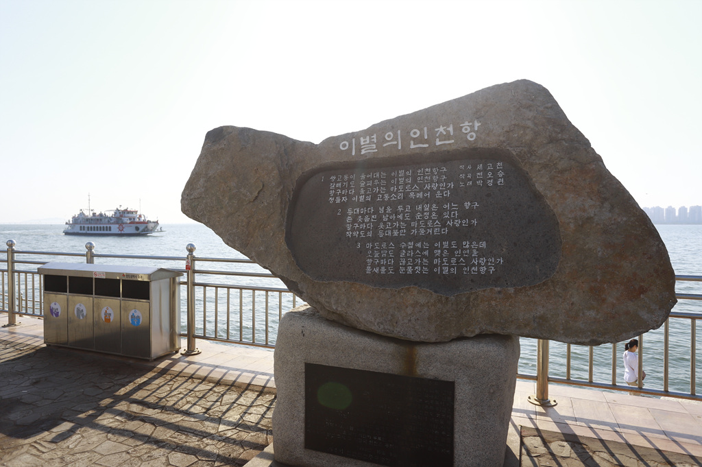 ▼ 인천을 상징하는 대표적인 노래가 연안부두와 이별의 인천항이다. 연안부두는 조운파 작사, 안치행 작곡, 김트리오가 1979년에 부른 가요이고 이별의 인천항은 세고천 작사, 전오승 작곡, 박경원이 1954년에 부른 가요이다. 1999년 10월 9일 이별의 인천항 노래비가 월미도 문화의 거리에 제막되었다.
