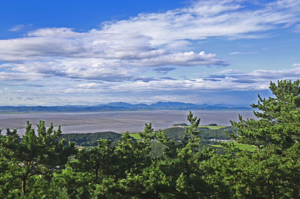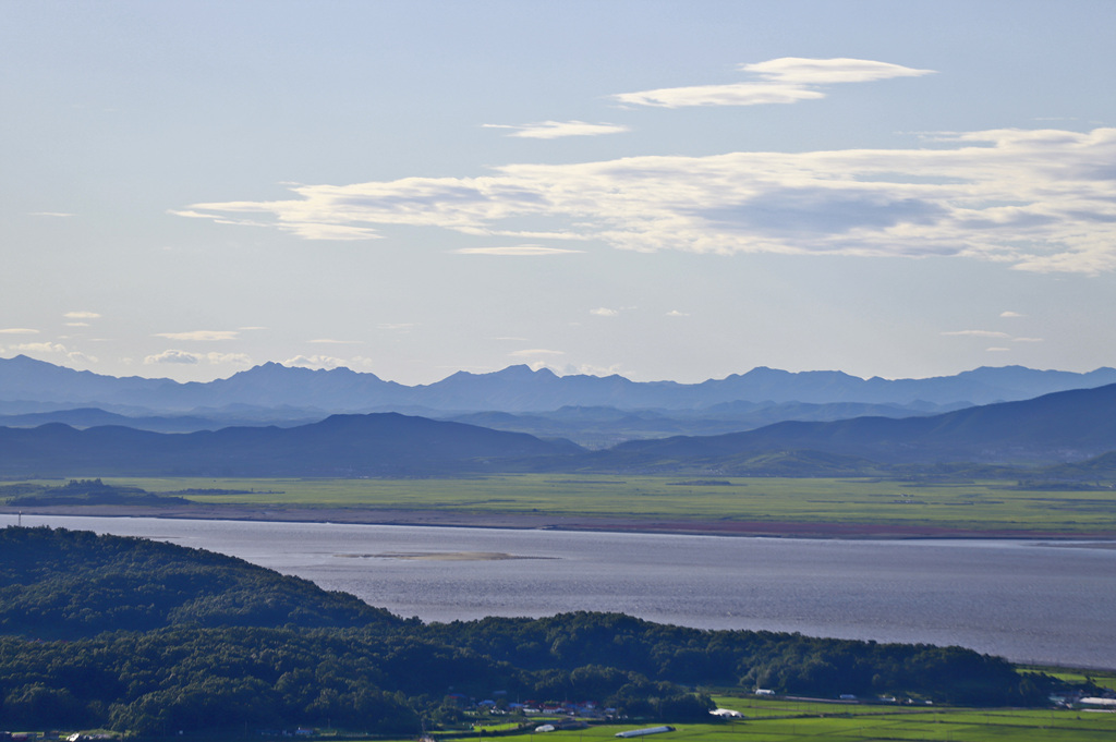 예성강 하구가 사진 중간에 보이고 멀리 개성의 송악산이 눈에 들어온다.