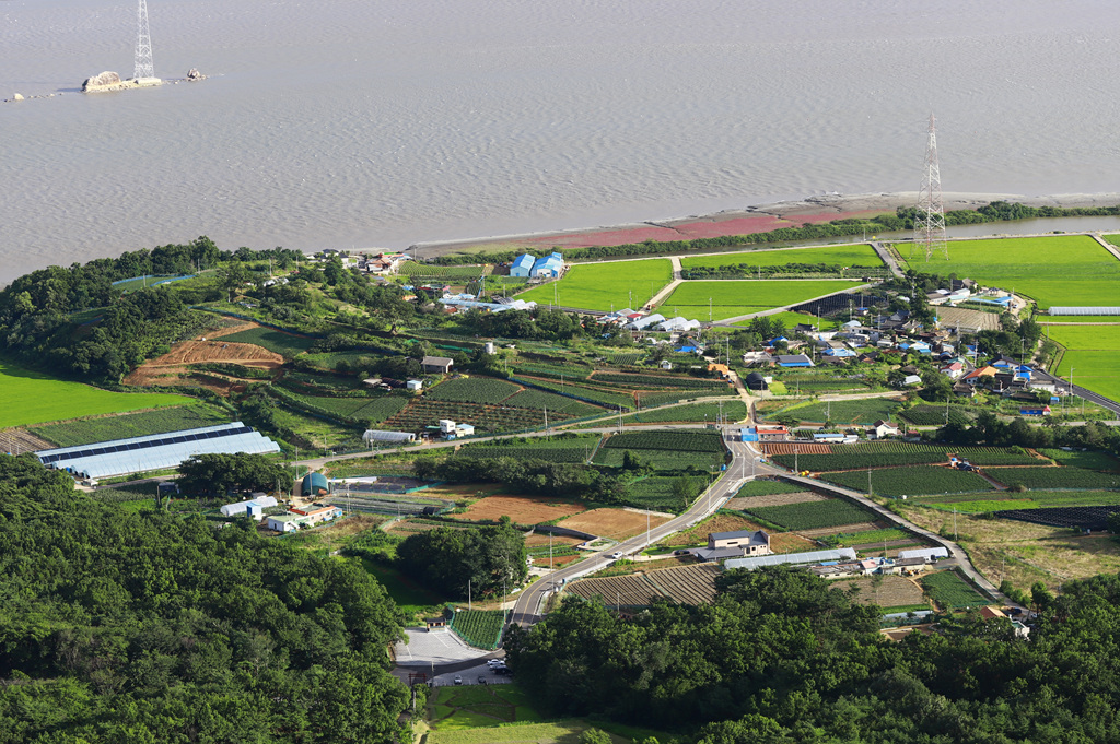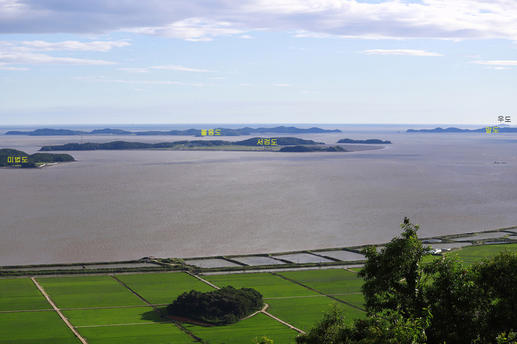 연백평야의 넓은 농경지가 쌀 곡창지대임을 말해 주고 있다. 가운데는 썰물일 경우 거대한 갯벌이 형성되어 육지나 다름없다.