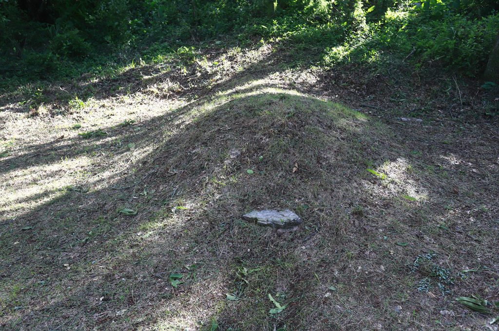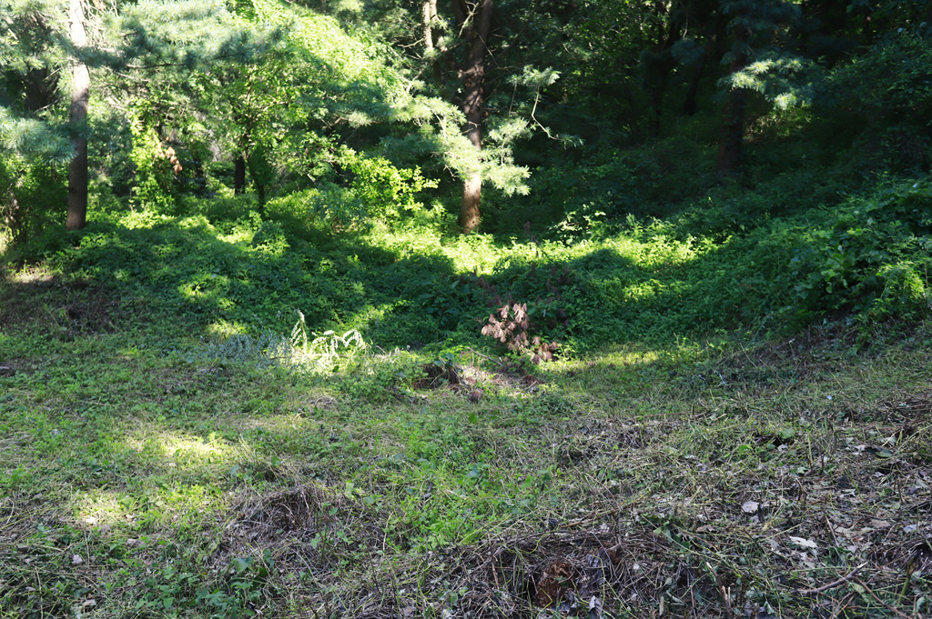 ▼ 약수터 윗쪽에 커다란 웅덩이가 있었는데 세월이 지남에 따라 거의 메꾸어진 상태다. 조선 전기의 대표적인 관찬지리서인 신증동국여지승람(新增東國輿地勝覽)의 교동현편에는 성안에 연못, 샘, 군창이 있다고 전해지는데 이곳이 바로 연못 자리이다. 역시 군사들이 사용했을 것으로 보인다.