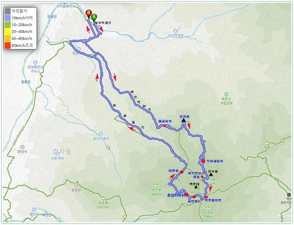 ♣ 산행코스: 사기막골 주차-해골바위-영장봉-악어새바위-인수협곡-백운봉암문-서벽밴드-춘양이바위-바람골-밤골-사기막골