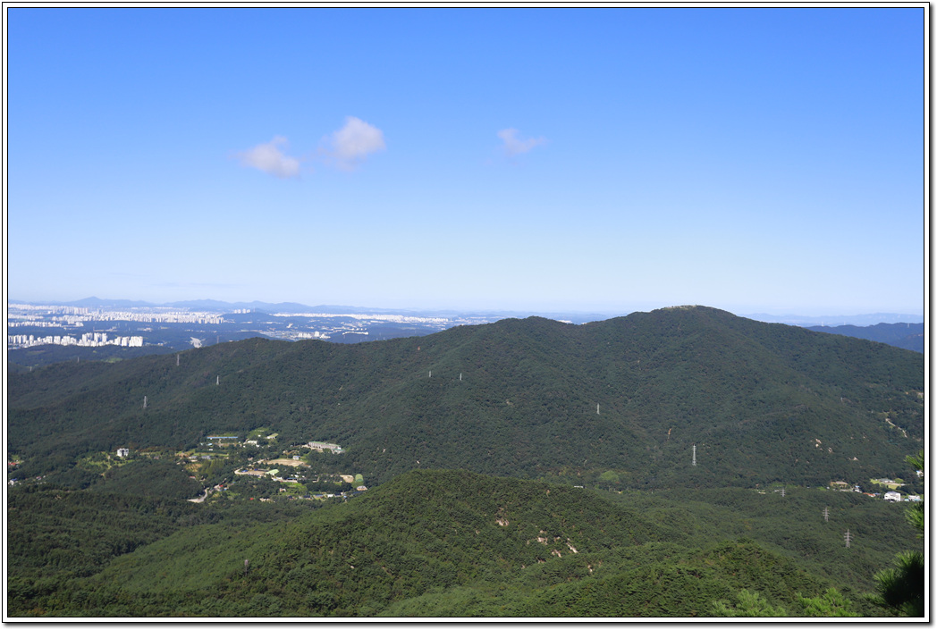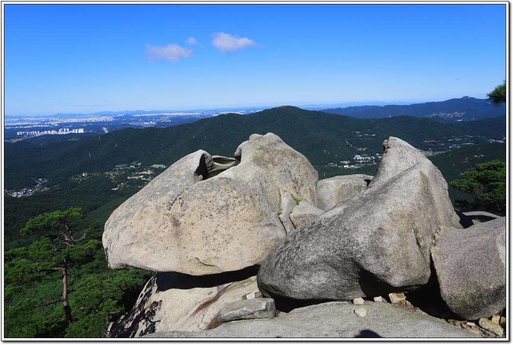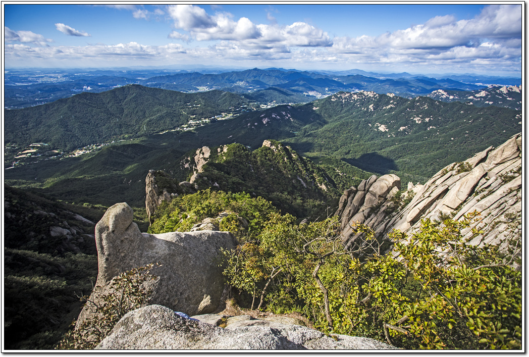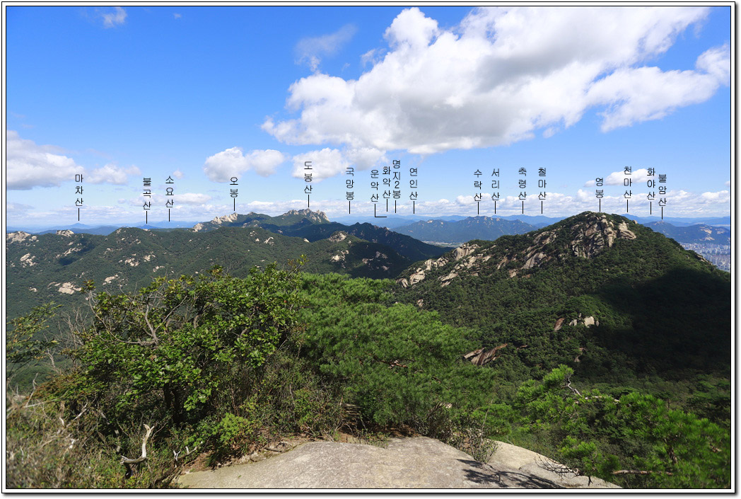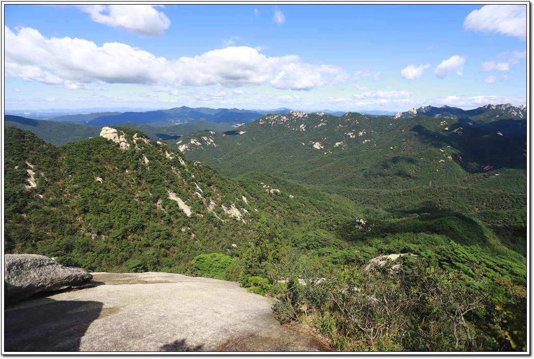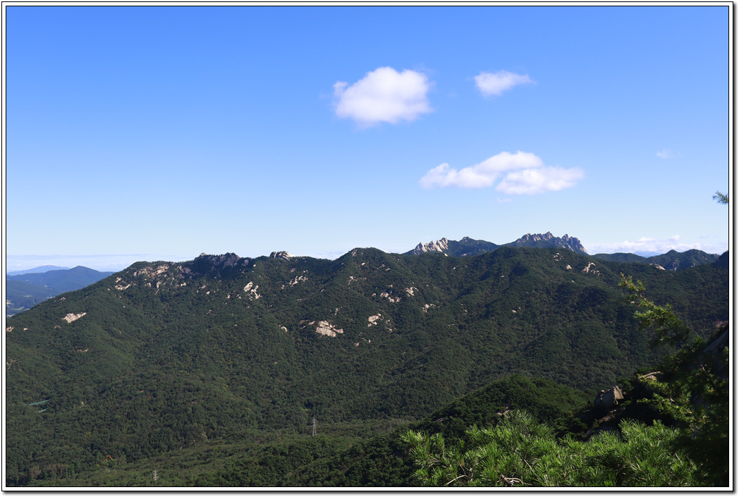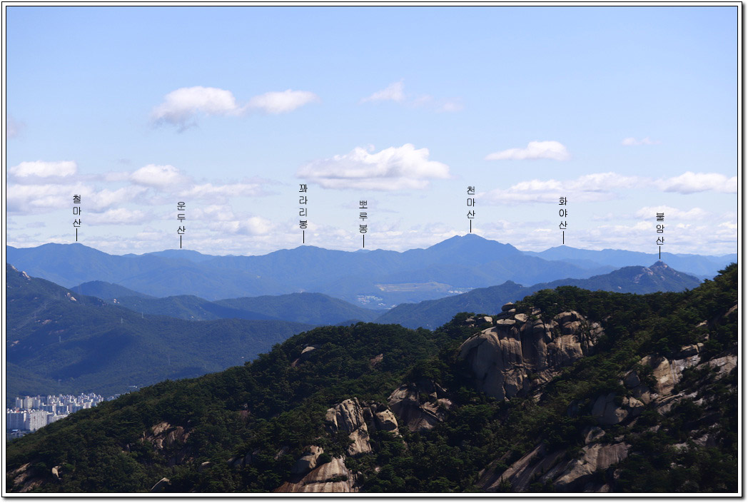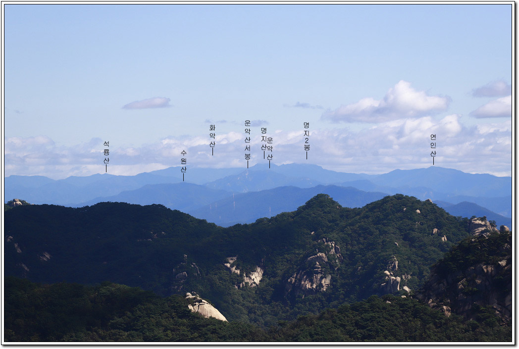 ▼ 영장봉에 올라서 본 동쪽 풍경...오봉과 도봉산, 오른쪽으로 수락산이 점점이 떠있는 흰구름과 파란 하늘과 어우러져 가을임을 실감케 한다.