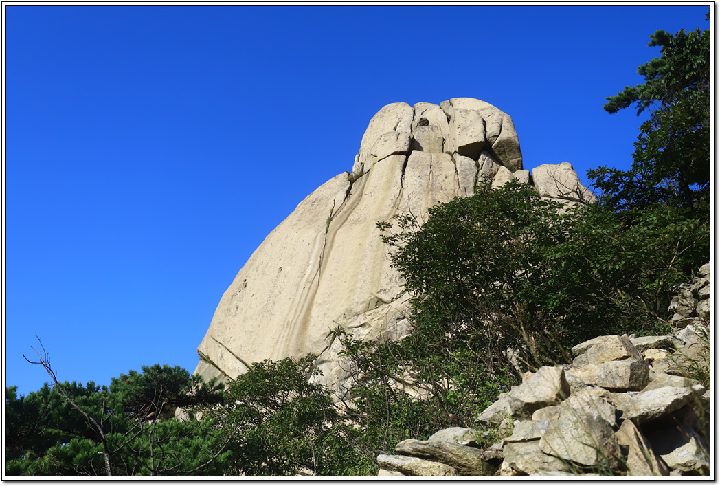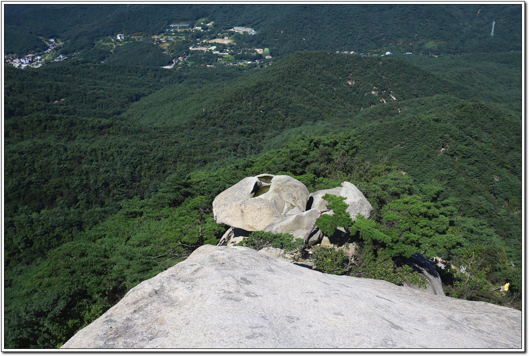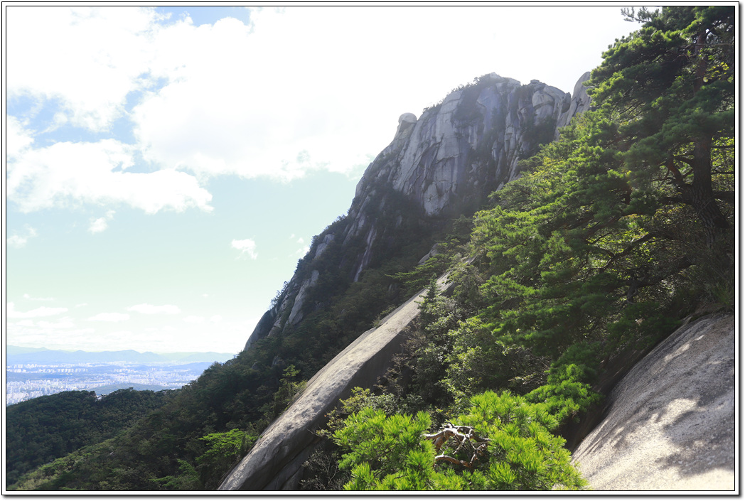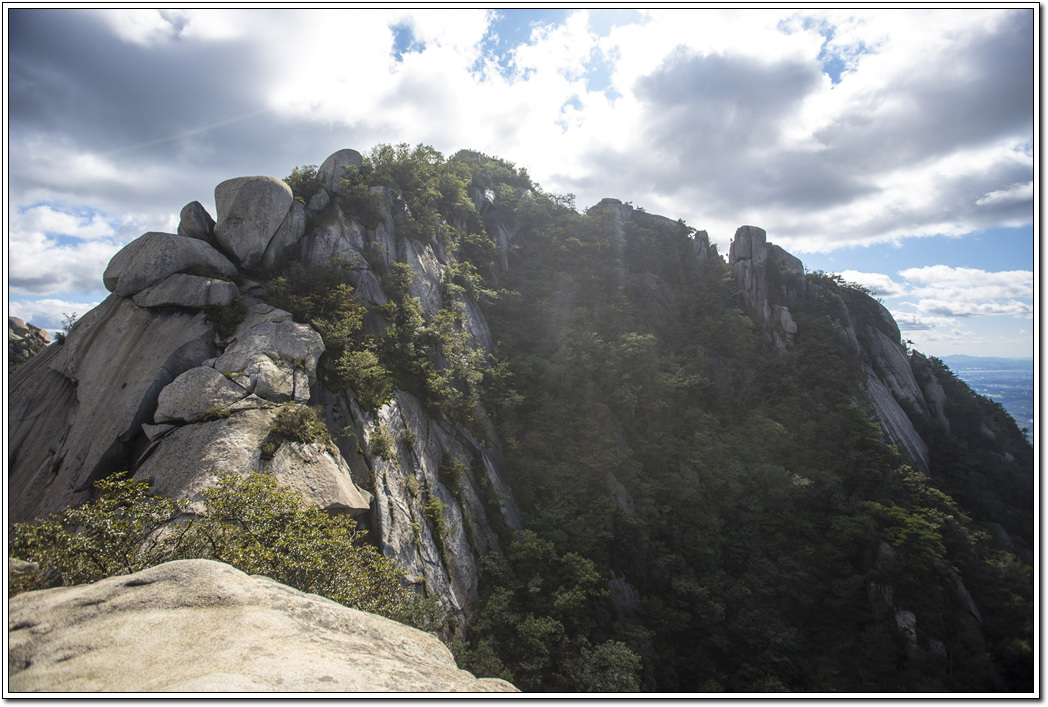 ▼ 살짝 등로를 벗어나 금줄을 넘어 서벽밴드 방향으로 이동하면서 첫 전망바위에서 담은 노적봉