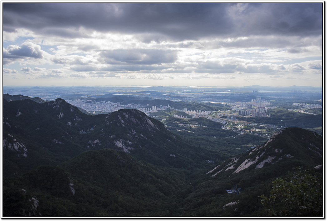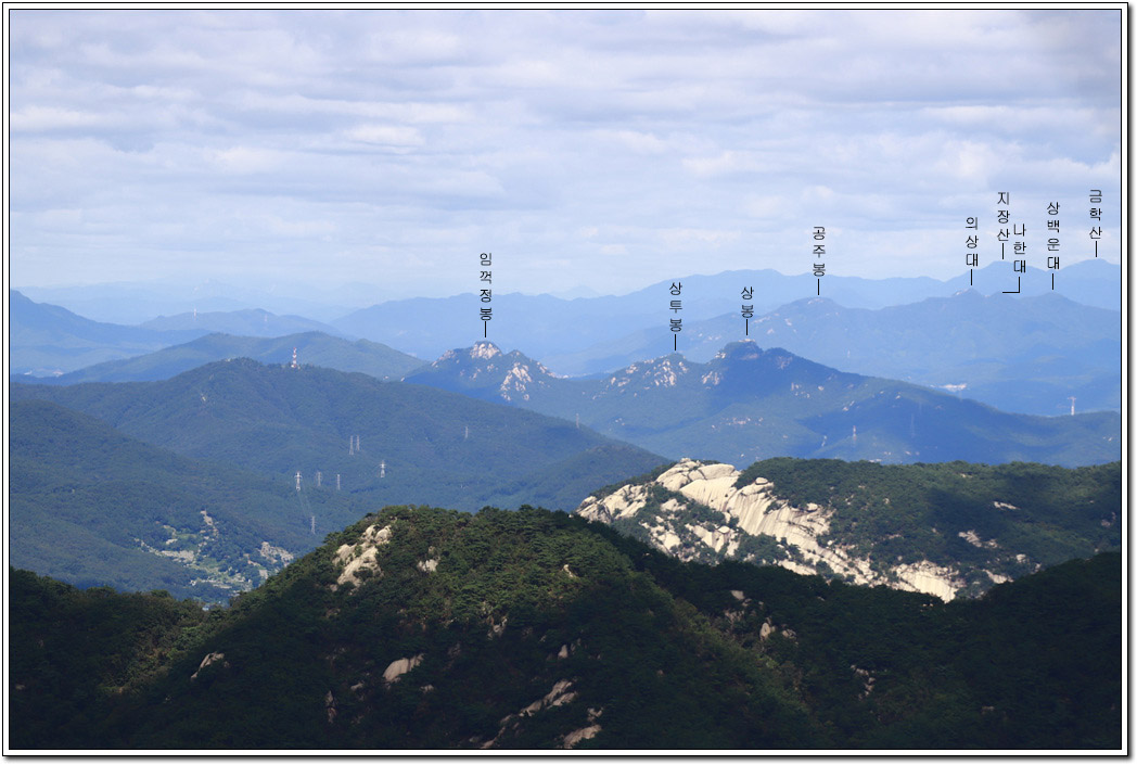 ▼ 오전에 구름 한점 없던 맑은 날씨가 15시 38분 현재 구름이 잔뜩 끼어 조망이 오전만 못하다. 왼쪽 의상봉에서 용출봉으로 이어지는 의상능선, 오른쪽으로 원효봉이 자리잡고 있다.