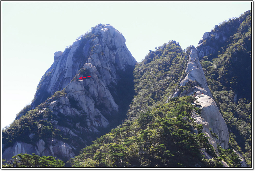 설벽 중간의 화살표로 표시된 곳이 악어새바위이고 저곳을 오르고 나면 돌아 내려와 바로 아래 그늘진 인수협곡으로 해서 올라갈 예정이다.