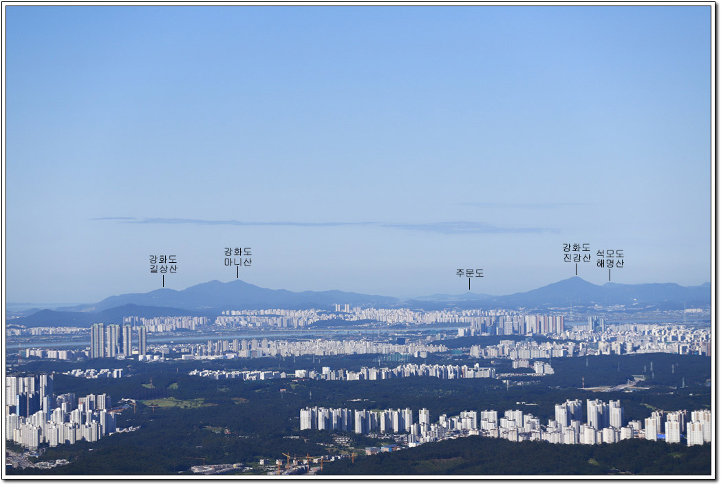 ▼ 날씨가 좋다보니 일망무제의 풍경이 펼쳐진다. 서쪽방향으로 왼쪽 멀리 인천 계양산으로 부터 오른쪽 강화 마니산과 진강산까지의 풍경을 담아봤다.
