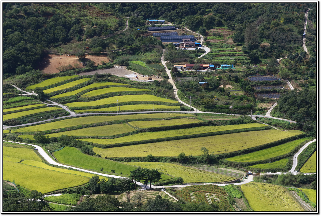 ▼ 하우스가 있는 주택이 고급스러워 보이고 그 아래 논들이 마치 남해 다랭이 마을의 다랑이논을 연상케 한다.