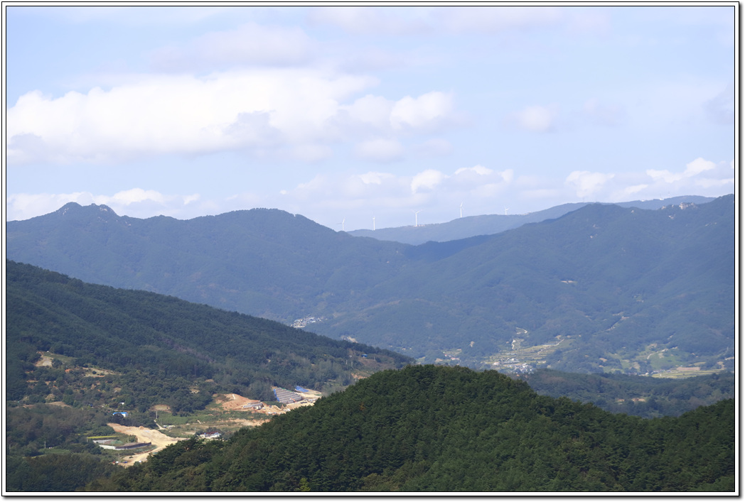 ▼ 멀리 왼쪽 월여산(862m)과 가운데 풍력발전기가 있는 능선 오른쪽 끝으로 감악산(945m)을 당겨봤다.