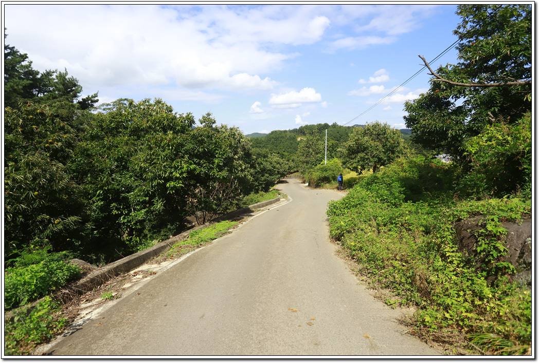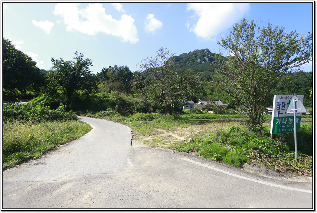 ▼ 밤나무 단지를 지나 장단리 마을로 접어들고 앞에 보이는 금성산 방향으로 1km 지점을 이동해야 한다.