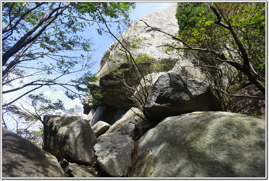 ▼ 등로에서 조금 벗어난 장군바위에서 되돌아 와 조금 오르니 엄청난 바위가 가로막고 우회하여 정상을 향한다.