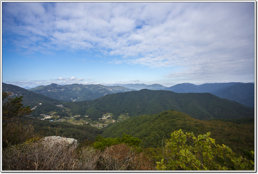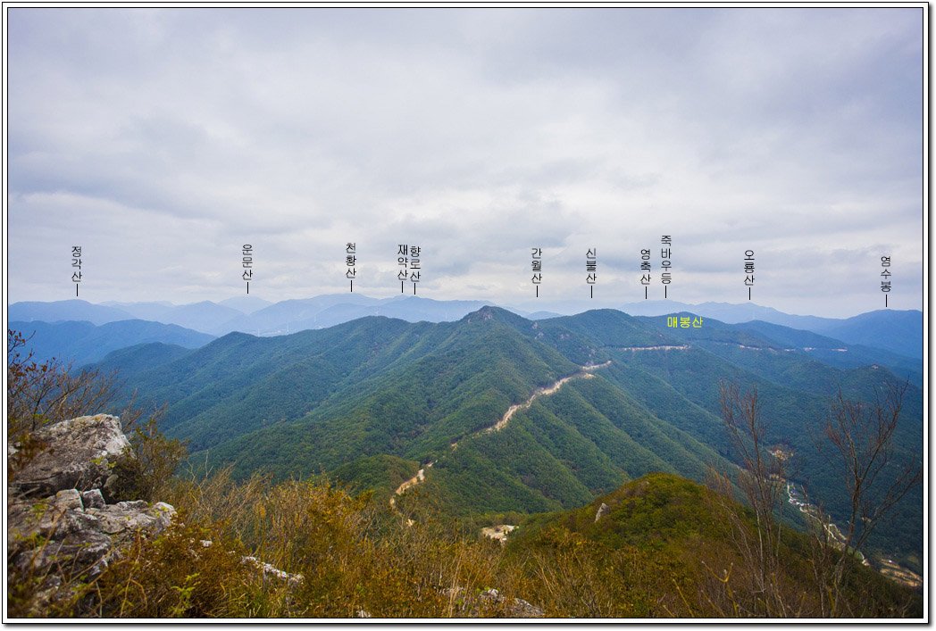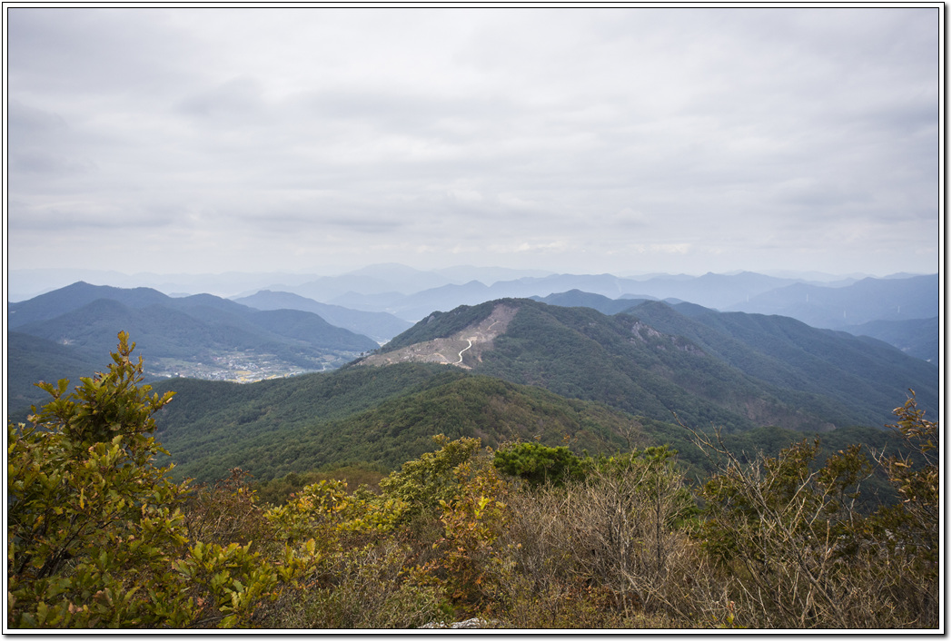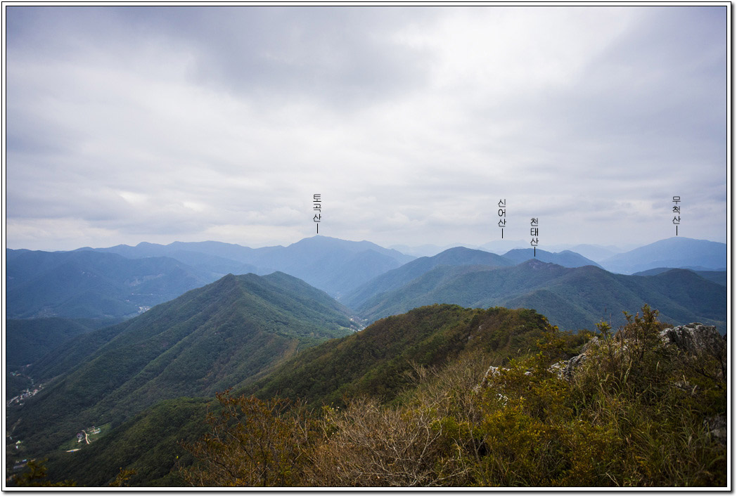 ▼ 시원하게 펼쳐진 조망이 일품이다. 특히 북쪽 방향의 영남알프스가 한눈에 들어온다. 다만 날씨가 흐려 파란 가을하늘이 아쉬운 풍경이다.
