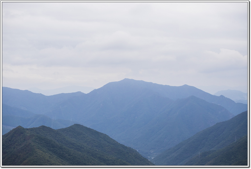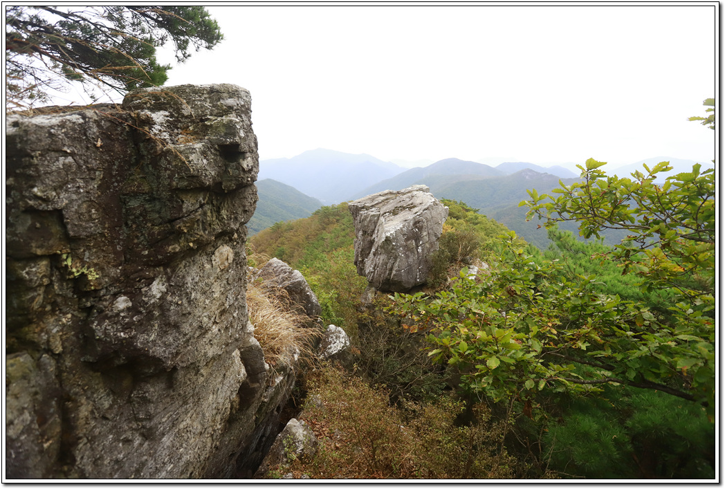 ▼ 진행 방향의 천태산으로 이어지는 능선 모습, 아직은 단풍이 들지 않은 상태로 서서히 푸른색을 잃어가는 모습이다.