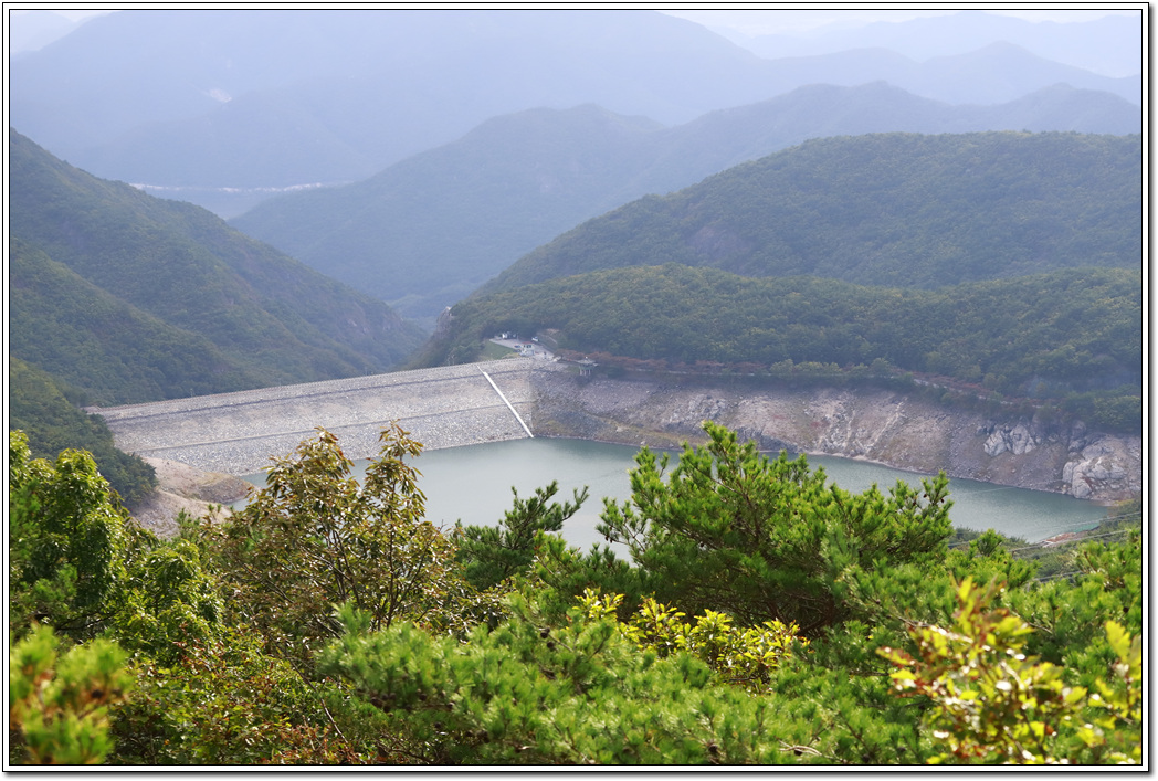 ▼ 천태호 제방을 보면 높이가 어마어마하다는 것을 느낄 수가 있다. 천태호는 우리 나라에서는 청평양수발전소에 이어 두번째로 건설된 양수발전소 상부댐으로서, 첨두부하(尖頭負荷) 수요충당과 전력계통의 효율적인 운용을 위하여 시설용량 600㎿(300㎿×2기)의 발전소를 건설하였다 한다.