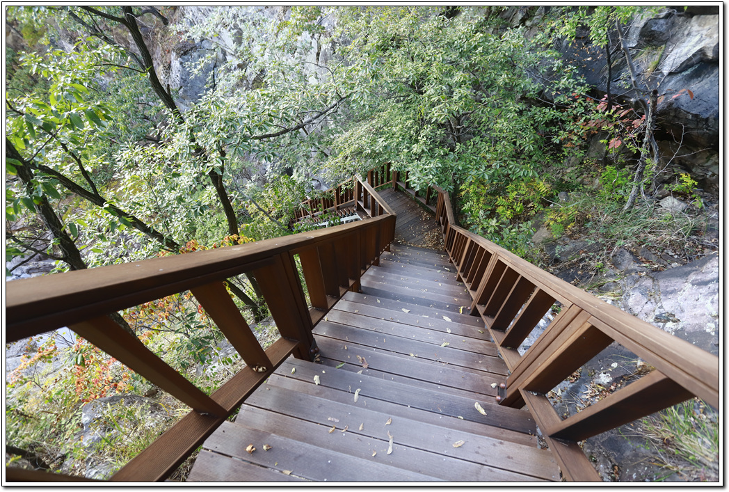 ▼ 절벽과 용연폭포 사이의 가파른 목재데크 계단을 내려서게 되고...