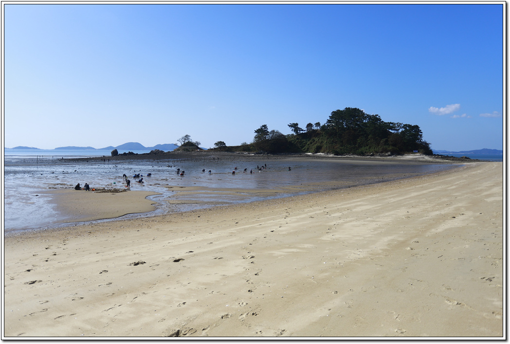 ▼ 조수 간만의 차가 가장 많은 물때라 해수욕장에서도 한참 멀리 빠진 썰물이다. 많은 인파들이 모래펄에 앉아 바지락 캐기에 여념이 없다.