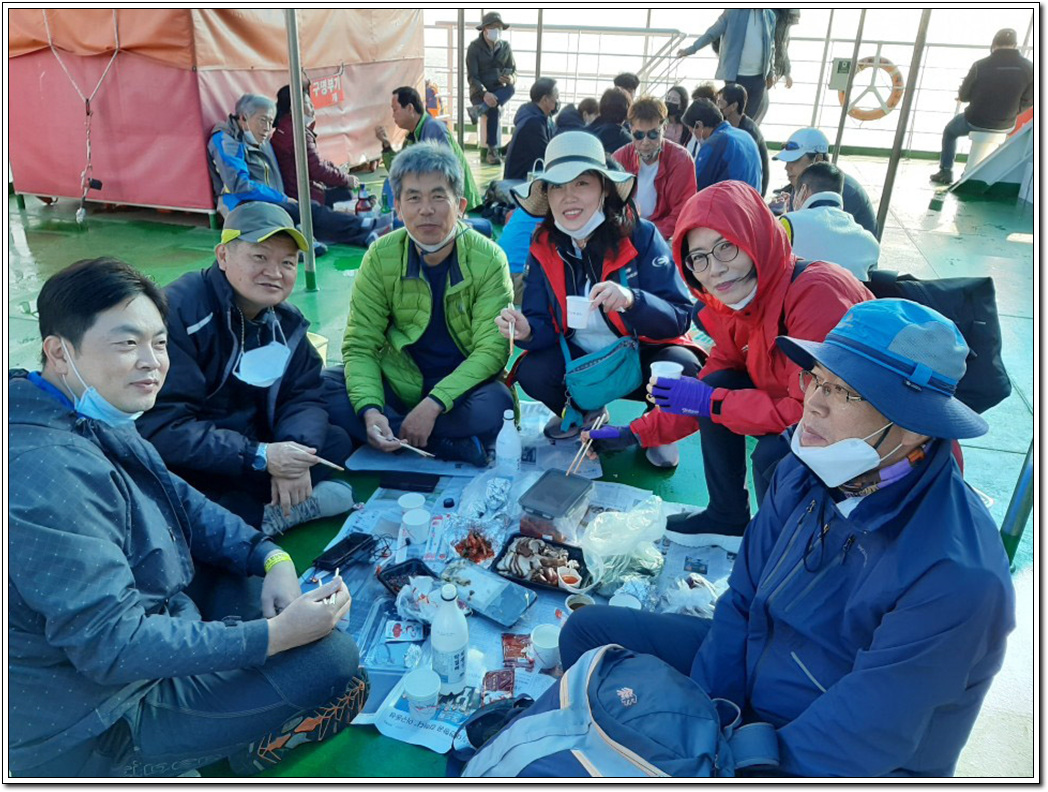 ▼ 배 안은 물론 갑판 이곳저곳 앉을 틈 없이 자리잡은 승객들로 만원인 가운데 모처럼 웃음꽃들을 피워본다.
